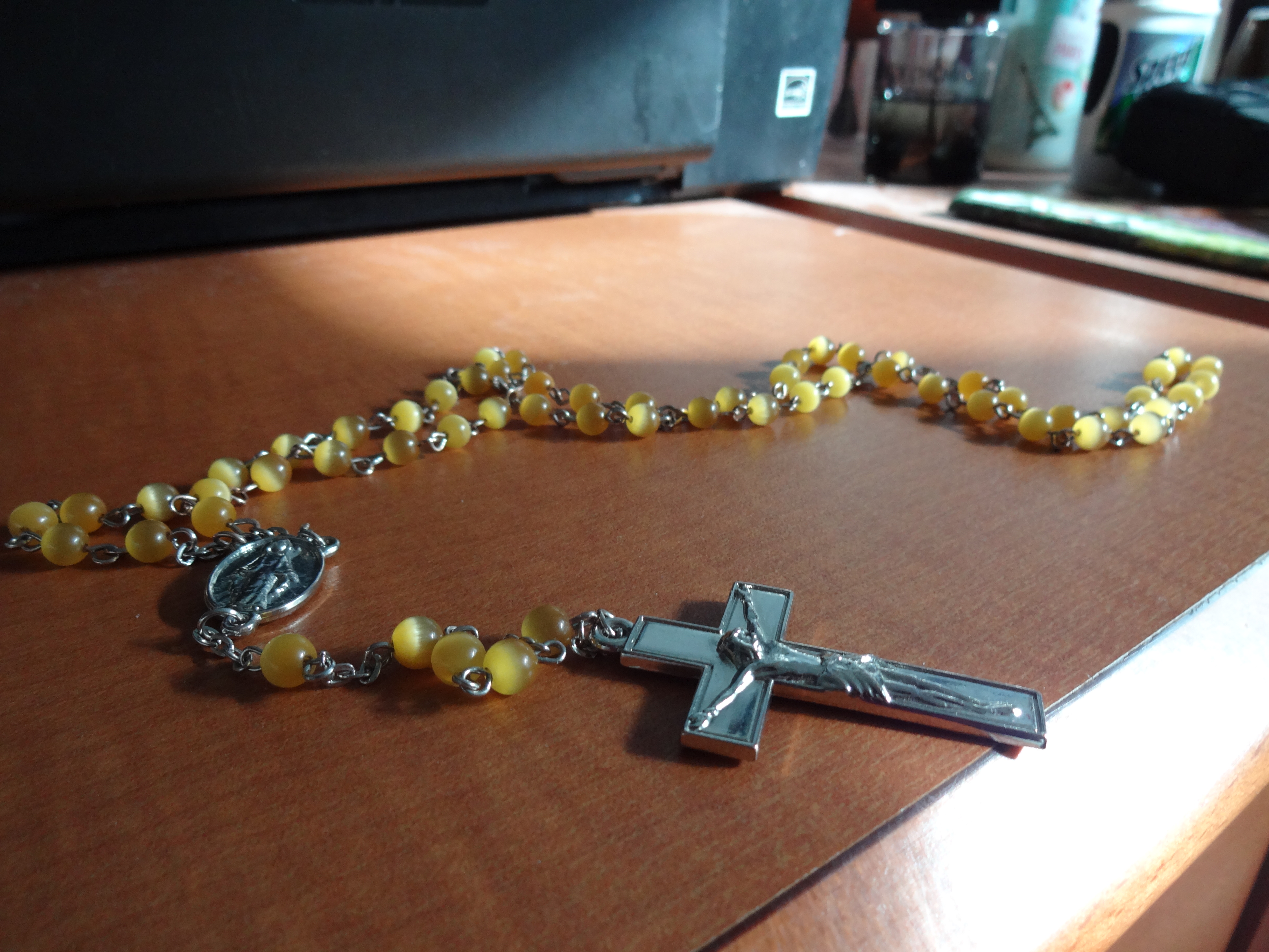 The beads together are about a foot long. The rosary is filled with yellow beads down a long metal chain. The separation between the beads from start to finish are about a half centimeter apart, with some variation as you go down the beads. They then become about a centimeter apart in some areas, but return to half a centimeter. As you continue on the chain of bright yellow beads, like a ring of suns attached to one another, the chains meet at an end. The ends are attached to an oval metal piece. On the oval is an engraved figure of the Virgin Mary. As you continue to scan the rosary beads, the metal pieces become one and are hooked to a cross, where Jesus is engraved with arms spread, a depiction of the day of his death. At the end, the rosary beads continue to have variations between one centimeter and a half a centimeter apart.