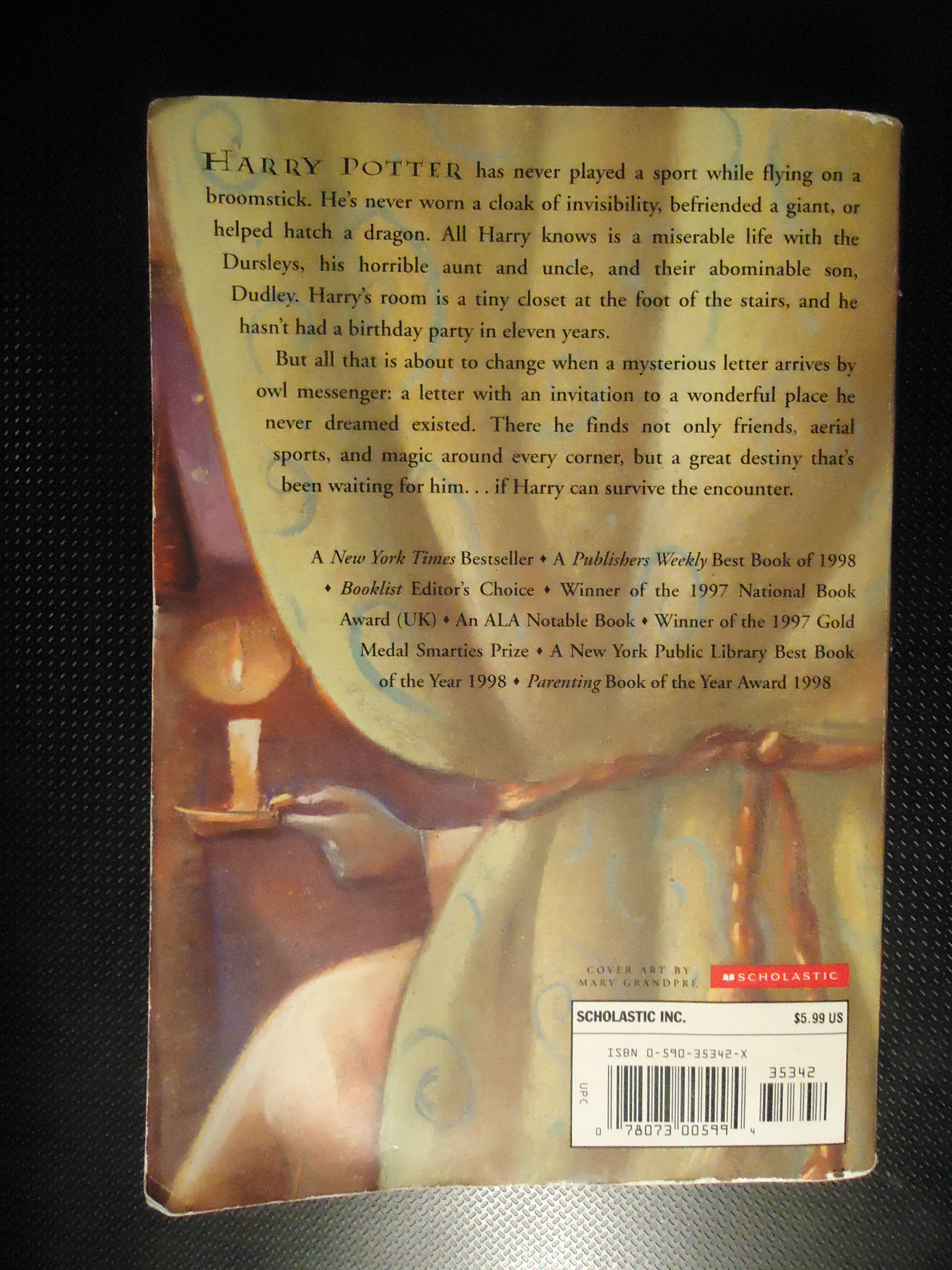 When deciding whether to continue exploring my previously mentioned item, a tattered copy of Harry Potter and the Sorcerer’s Stone, the object’s lack of inheritance or personal cultural significance stopped my initial drive short. After one post about a very well-known, non-antique item, I could no longer see what should be described. I focused in on how my copy reflected my memories with the prized item, rather than vivid details of the book itself. Even though I provided pictures of the novel, you could not inherently know that cracked embossed metallic silver-gold lettering for the author, series title, a “THE EXTRAORDINARY NEW YORK TIMES BESTSELLER,” and the writing on the spine still stood out from the smooth, semi-sheen outer book layer. You would not conceptualize the size of the novel: 7.5×6.5x.75 inches, which is small compared to the hardcover and later books in the series, but large for its time as a juvenile novel. You could not visualize the semi-coarse pages glued to the spine, as opposed to a much sturdier woven fashion, marking the paperback as a massed-produced, short-lived item rather than an object worthy of artifact-status centuries from now; I will prove those bookmakers wrong. You could not identify the typeface, even by looking through the pages. Despite several online ask.com users stating the back cover of each Harry Potter novel identified its typeface, a 12-point Adobe Garamond, such could not be found in my edition. I love its fallacy. The other font, used across the novel for chapter numbers on the table of contents, the dedications, numerous “HARRY POTTER AND THE SORCERER’S STONE”’s before the story unfolds, chapter titles, the two-line drop-caps, page numbers, and headings, reveals the sheer magic of the novel, conjuring new font styles for visual delight. Mugglenet, a well-established fan-based Harry Potter website, provides a nearly-identical font called Lumos for all the obsessed Harry Potter fans. The same font exists on the cover page and spine’s metallic words, except “Harry Potter”: mimicking-font “Harry P” on Mugglenet almost matches the unique typeface except for more stubbly jagged lines for the electric-style stem of the “P.”