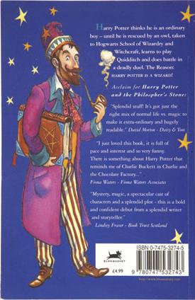 In contrast, the UK Bloomsbury edition of the first Harry Potter book features a much more simplistic illustrative and type style. The front page, with title, illustration, and front-page praise divided by thin green lines, distinctly separate images from words. “HARRY POTTER,” written in a gold Times New Roman, and “and the Philosopher’s Stone,” written in a small, white italic script, sit upon a solid crimson background. Underneath, an orange oval encapsulates a “J.K. Rowling” in a black Times New Roman-esque font style. The illustration of Harry Potter in front of the Hogwarts Express on Platform 9 and 3/4, evokes a distinct cartoon style with thick lines, bright colors, and unrealistic indications of time, place and environment. The Hogwarts Express, written in gold against a large green plate on the front of the red train, overtly proclaims its presence; the “9 3/4” sign towards the top looks like a piece of parchment floating in the sky; and stars within the smoke evoke magic rather than a realistic portrayal of stars with bright colors and skewed angles. The first back cover featured a wizard named Wizzy, created by illustrator Thomas Taylor and completely unrelated to the book content, donning a very odd wardrobe of purple and brown, carrying a large brown book, and smoking a pipe. The book description is just as silly: “Harry Potter thinks he’s an ordinary boy — until he is rescued by an owl, taken to Hogwarts School of Witchcraft and Wizardry, learns to play Quidditch, and does battle in a deadly duel. The Reason: HARRY POTTER IS A WIZARD.” After a few editions, Wizzy is replaced by Albus Dumbledore holding a Puter-Outer, and the summary receives slight renovation, though nothing compared to the eloquent, enticing summary on the US editions. Of course, by the time the novel reached the US, Americans were already ecstatic about the story, buying UK editions. The US cover reflects achieved fame, while the UK cover expresses a small hope in a long, complex children’s story nearly unprecedented across the globe.