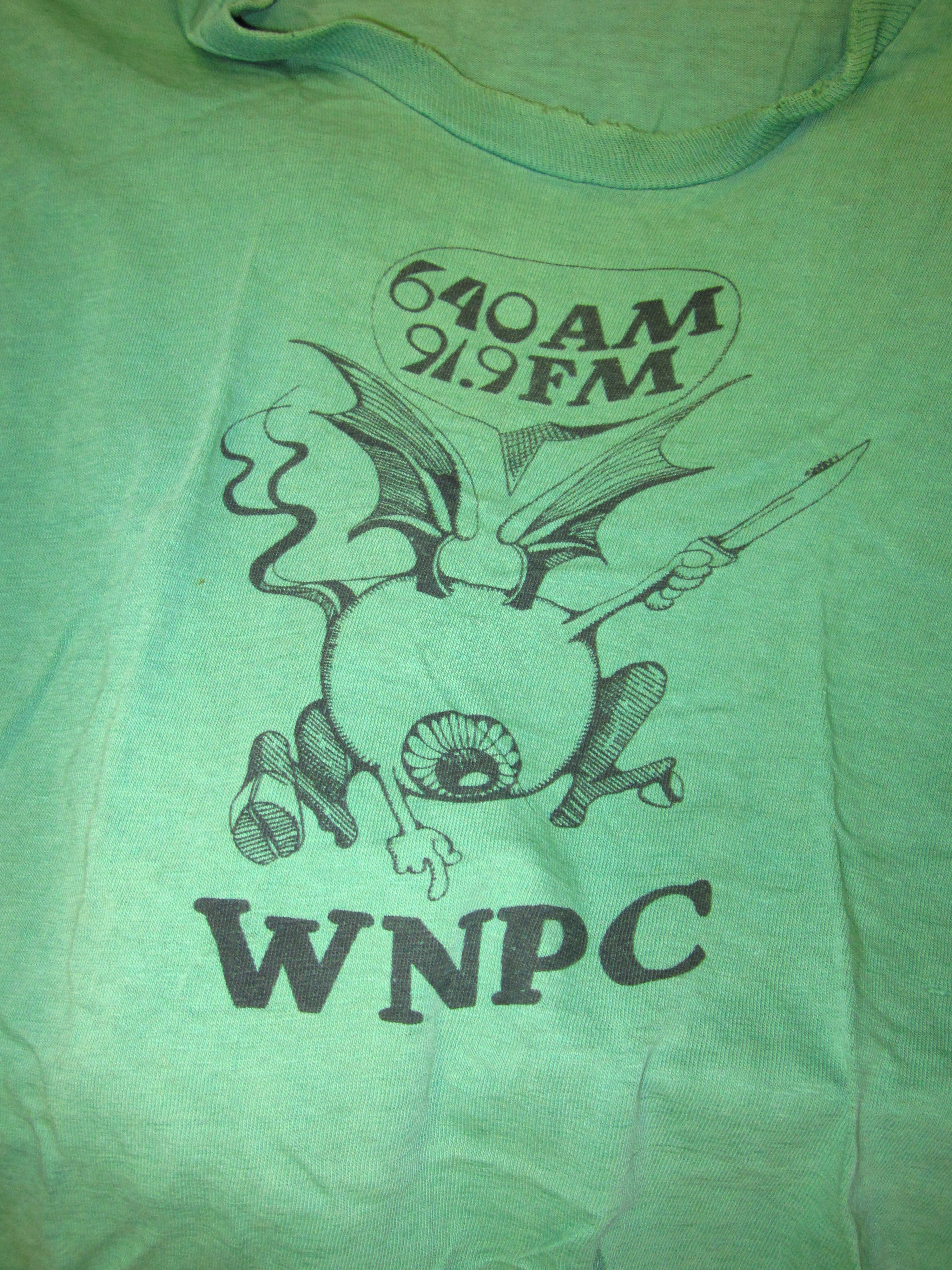 earliest T-shirt is a light green, with an image outlined in black of a winged, hooved eyeball holding a sword and pointing downwards to the station’s call letters “WNPC”. There is a speech bubble above the eyeball with “640 AM, 91.9 FM” within it. This particular T-Shirt is a size large, and has been frayed around the edges with persistent wear. It is made of cotton and is soft to the touch.