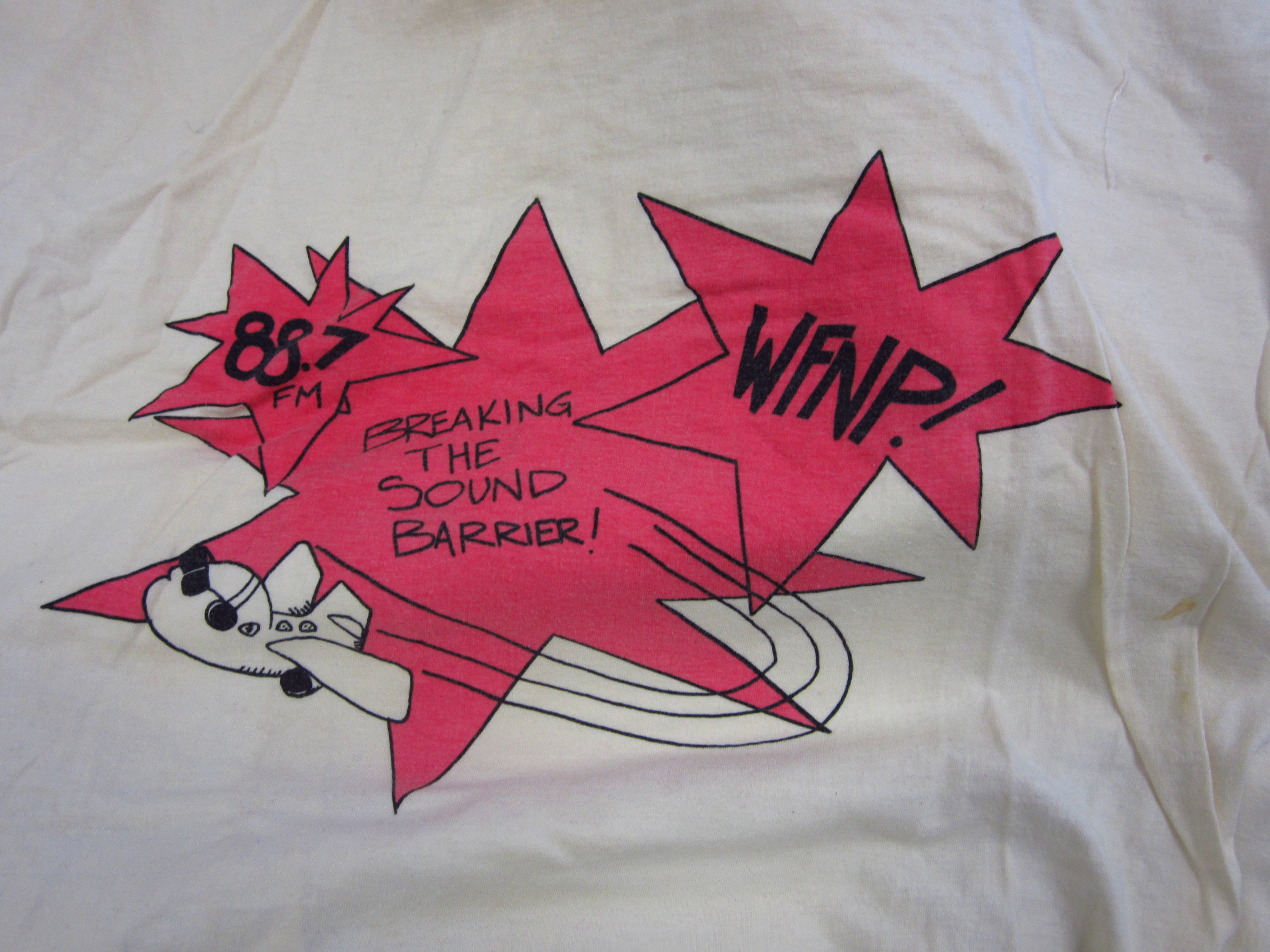 a comic book to express an explosion or onomatopoeia. The largest explosion shape in the center reads “Breaking The Sound Barrier” in black lettering. The mid-sized explosion shape on the right hand side says “WFNP!” in bolded black lettering, while the smallest pointed shape on the left side says “88.7 FM” in black lettering. There is a white cartoon airplane with sunglasses and headphones flying out of the pointed shapes. This shirt is wrinkled, and appears to have a few small coffee stains on the front, in addition to some yellowed sweat stains in the armpits.