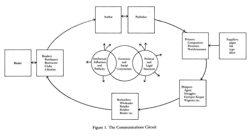 According to Darnton, book historians take a singular section of the full cycle and analyze, then contextualize the part to the whole, particularly in the context of and to describe the economic, social, political, and cultural environment. In “What is the History of Books?”, Darnton offers the publishing history of Voltaire’s Questions sur l’Encyclopedia, particularly analyzing the role of the bookseller Rigaud, to vividly illustrate the full cycle and reveal crucial missing evidence that continues to leave holes in the book history narrative. The successful bookseller relies on the readership, just like the author, and Rigaud’s variety in his bookshop catered to varied audiences: “travel books, histories, novels, religious works, and the occasional scientific or philosophical treatise” (Darton 70). Similarly, the bookseller competes with other businesses, vying for dominance in the industry, just as one could find today with the liquidated Borders and expanding Barnes & Noble. Yet, Darton’s questions towards all part of the cycle, starting on page 75, reveal the heavy burdens of the study of the history of books. Some documents persist to answer the questions, but not enough data can be found to solidify conclusions about mainstream literary trends.