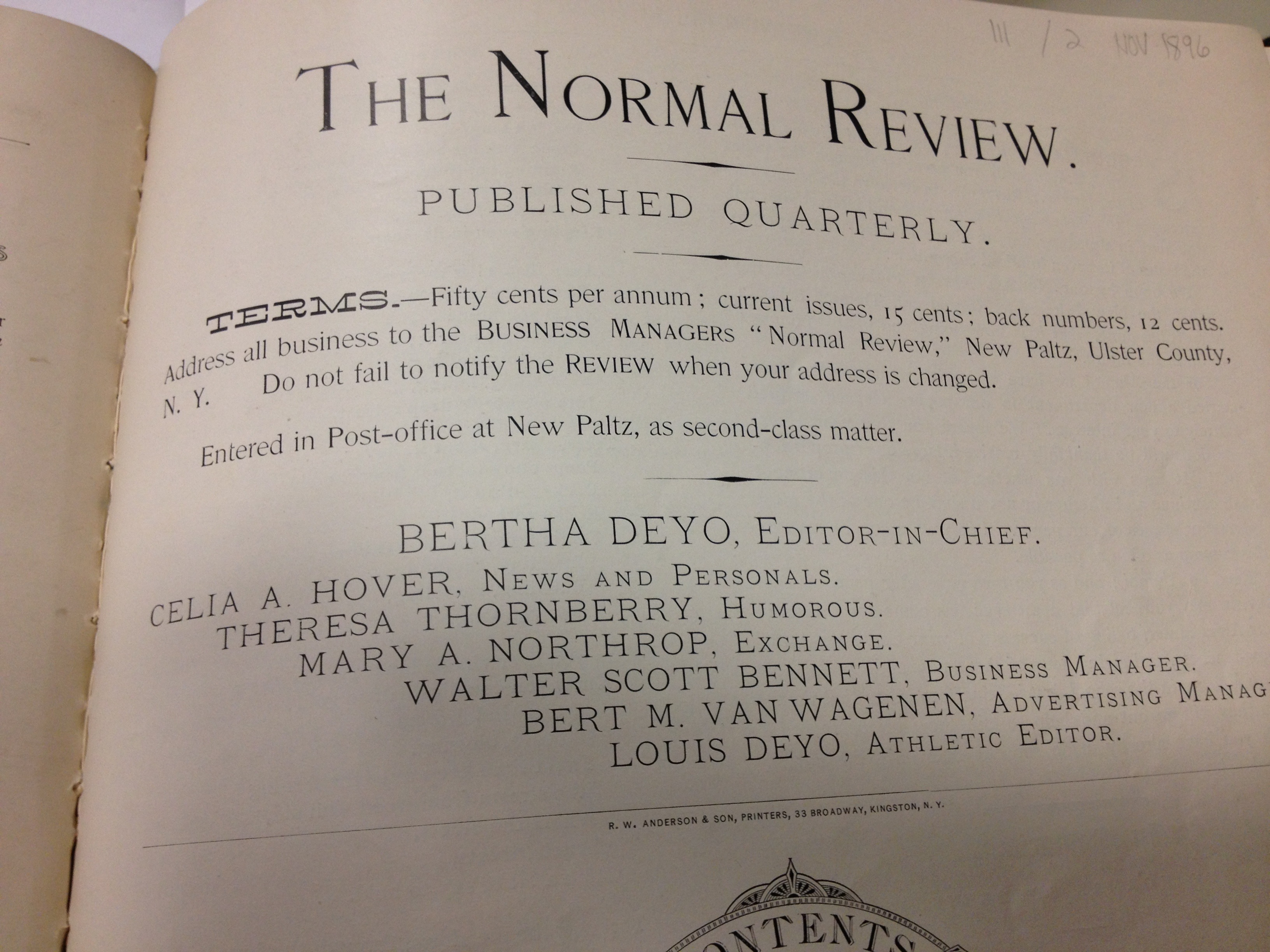 The New Paltz Normal School. “The Normal Review.” SUNY New Paltz. 1894. Print. 7 Apr. 2013.