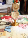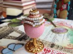 My sister gave it to me for my birthday. It’s a small, light pink egg on a skinny gold stand. It’s barley over two inches tall. All the exposed egg shell has been painted pink and glittered. The stand’s base is flat and rounded with swirling impressions on it like an ancient coin. The actual column of the stand tapers at the top and is impressed with a swirling pattern. At the top the stand, little gold leaves form a small bowl for the egg to sit.