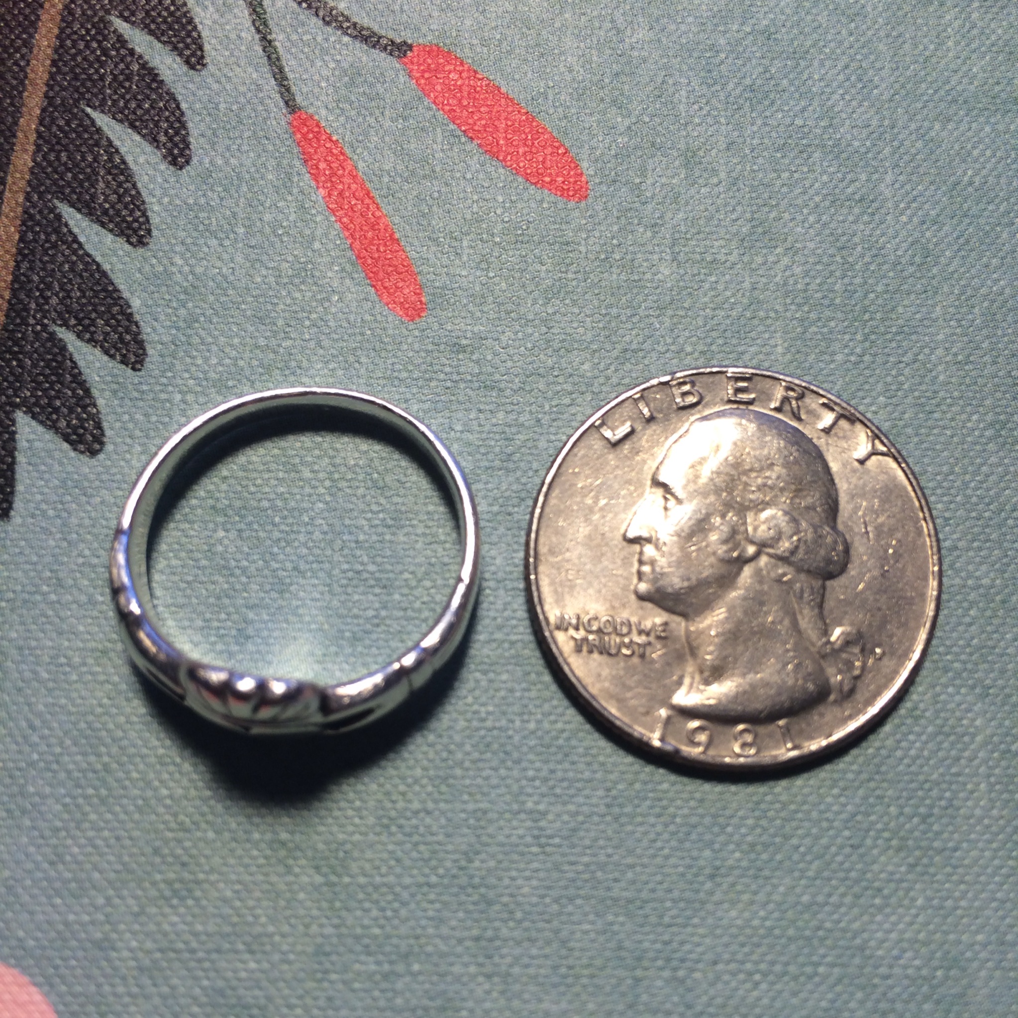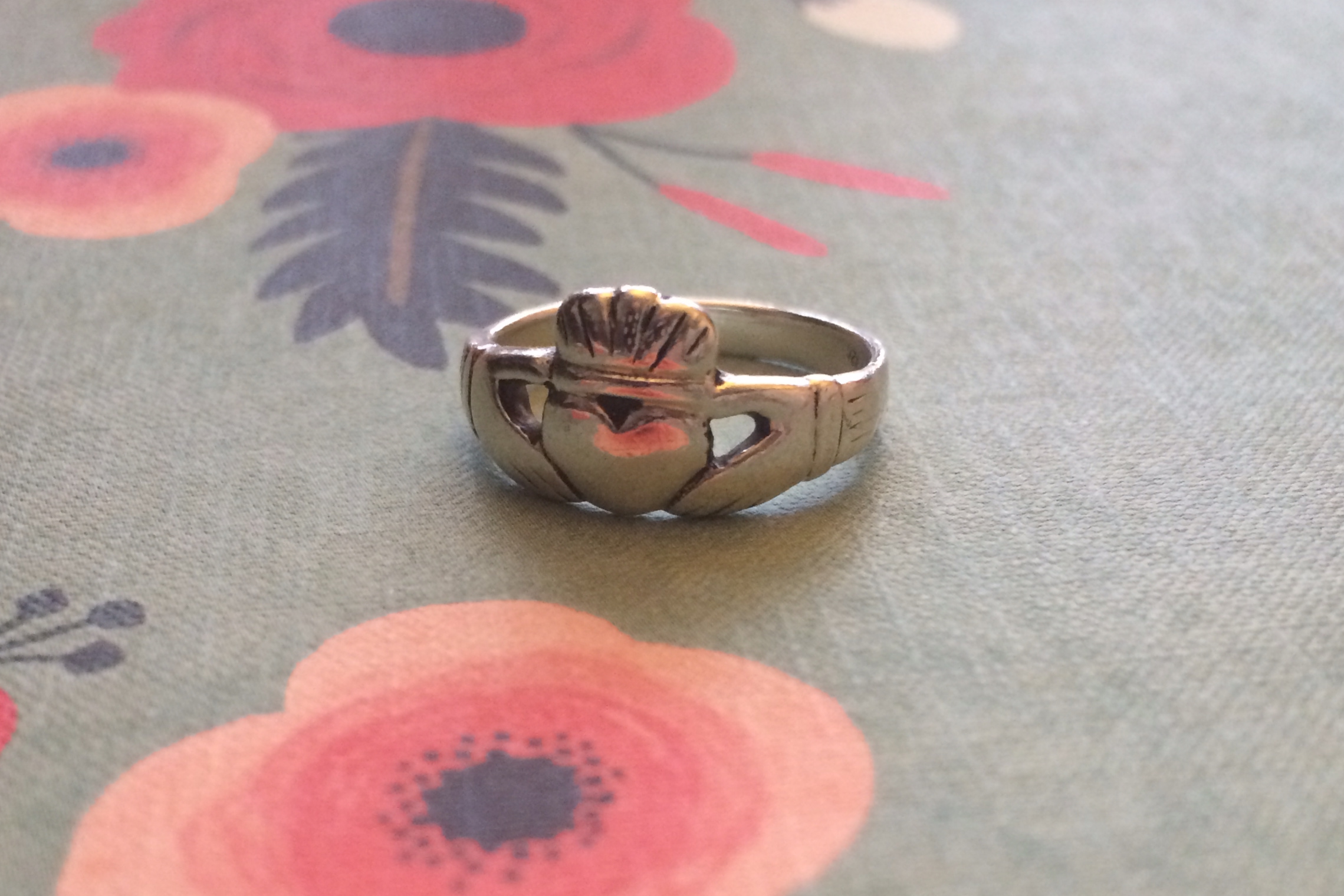 This ring’s home is around the index finger of my right hand, though for the longest time it had been worn around that hand’s middle finger. It is a size 7 and when taken off, the shape of the ring is circular, despite its slightly irregular shape, likely due to wear. I was given this ring nine years ago, nearly to the day, (my birthday was on Friday!) when I turned 13. My grandmother gave me this ring as it represents our Irish heritage, it being a traditional claddagh ring. photo 1-2