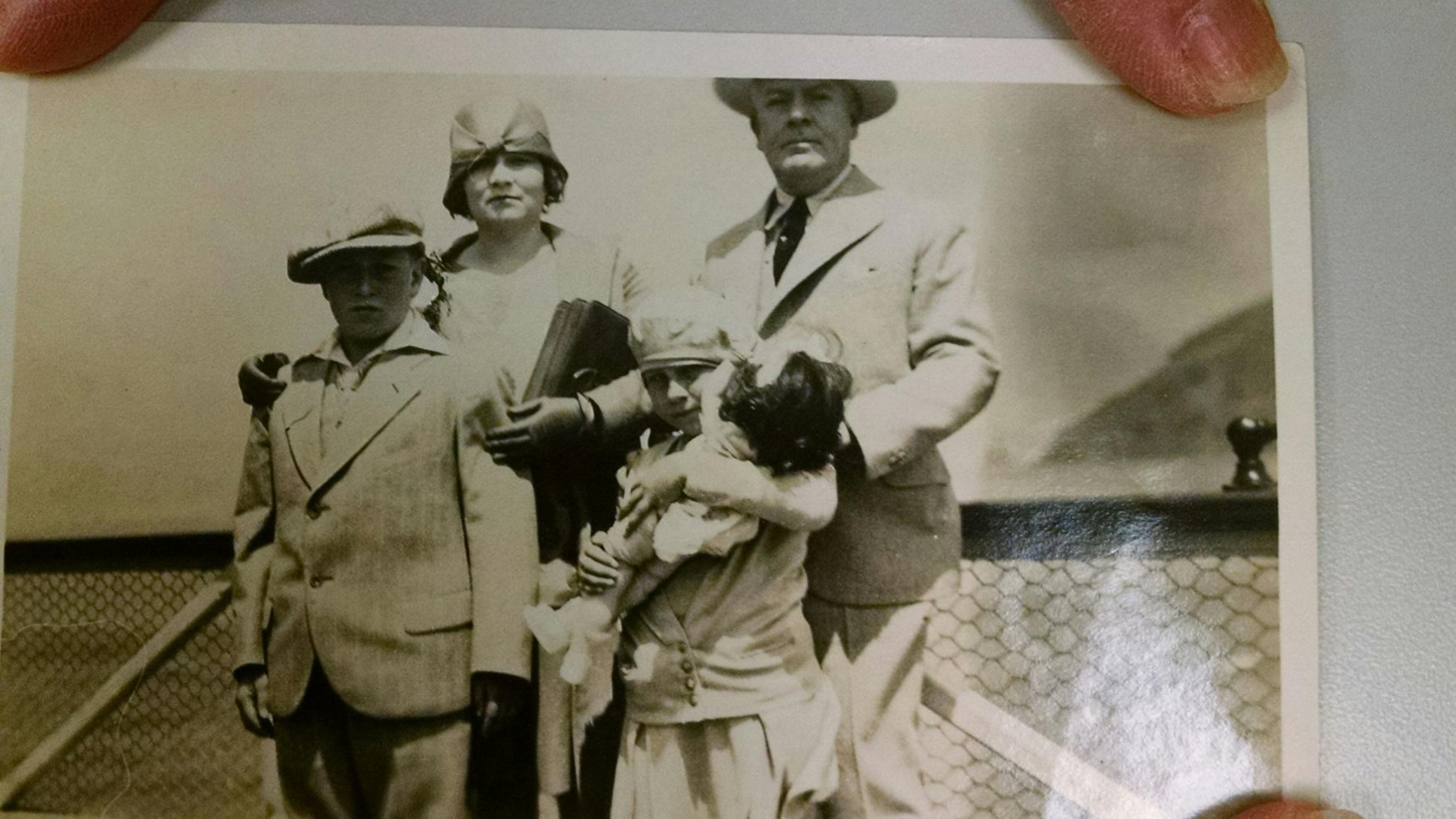 The de Jaureguis, circa 1930s. Young Emilio and Stella (clutching a doll) standing with their parents on what appears to be the deck of ship.