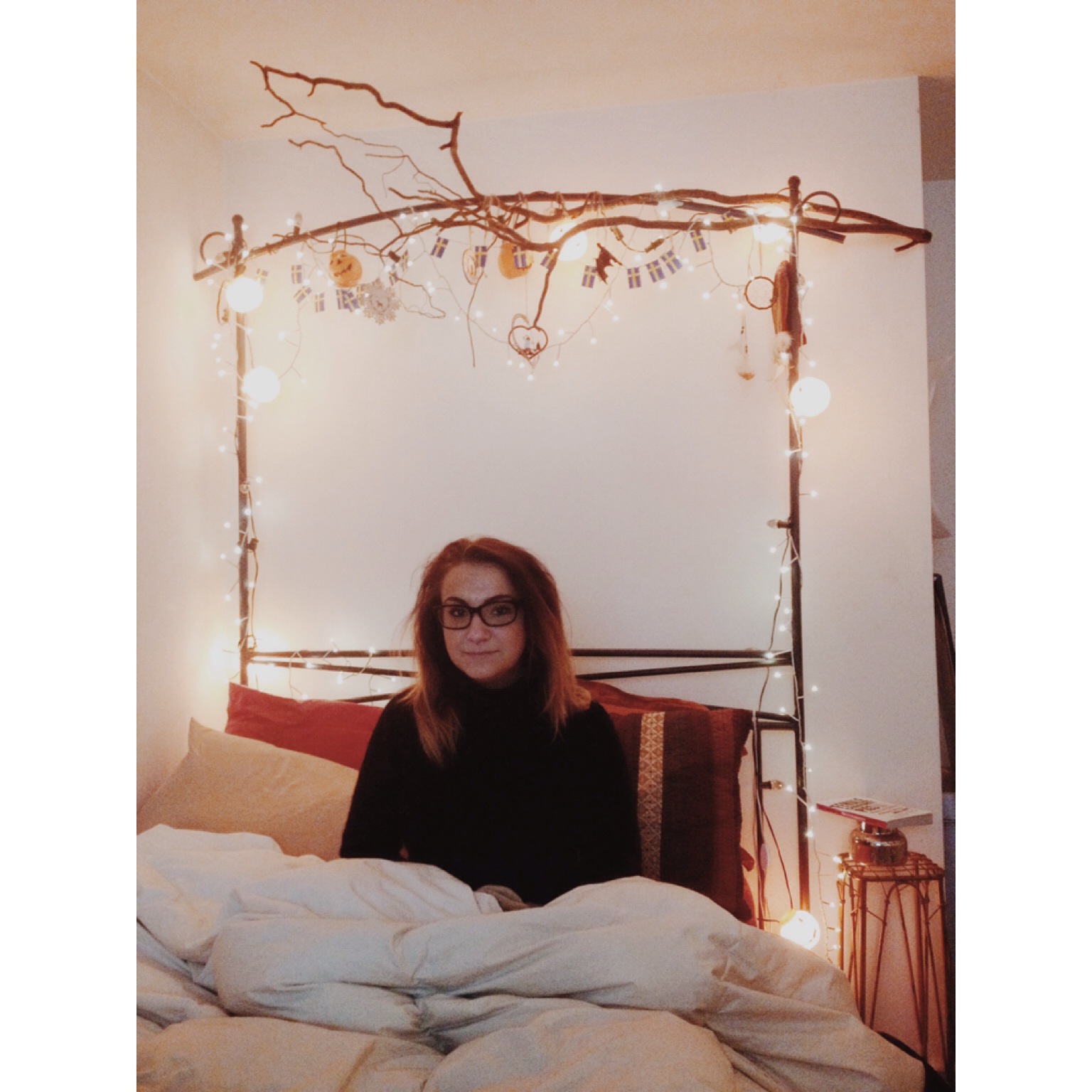 What may sound like an erratic display of Halloween paraphernalia actually functions as a work space, befitting of a creative and scholarly mind. And amongst the knick-knacks and tree branches is a large bed, that sits like a cloud in the near center of the room. It’s a place friends have congregated to discuss our rather mundane grievances during our college life. A sort of refuge for us all as we’ve filtered in and out of our friend’s home. As the bed is the most normal looking thing in the room it was a good place to sit and take it all in. And as I looked around I realized, everything in here has a purpose. The tiny bats and pumpkin lights that hang from every corner of the room, serve as a reminder of Alexa’s love for the whimsical and perhaps the spooky. The small Swedish flags and wicker witches that hail from the same country are telling of her heritage, and the love she has for those family members that come from Sweden. As far as the rather psychotic sounding mannequins that live in her room, her grandfather does sculptures from these very items. It’s safe to say my friend lives among these items, not the other way around. She explained that although these things seem like they have no use, they do for her. They are all, in some small way a part of her which she projects into her living space. There is a certain darkness to the room, it’s true. But there are points of the romantic throughout. Lace curtains, nostalgic photos and large earrings hanging from a heart shaped holder also live here. It’s a kind of representation of the many sides of Alexa, The seemingly rough exterior houses a more delicate side. Perhaps I can only take this away from the room because I know her well. As I said, the room as a whole, may be confusing if you don’t know her. It’s just fascinating how much a living space can say about a person.