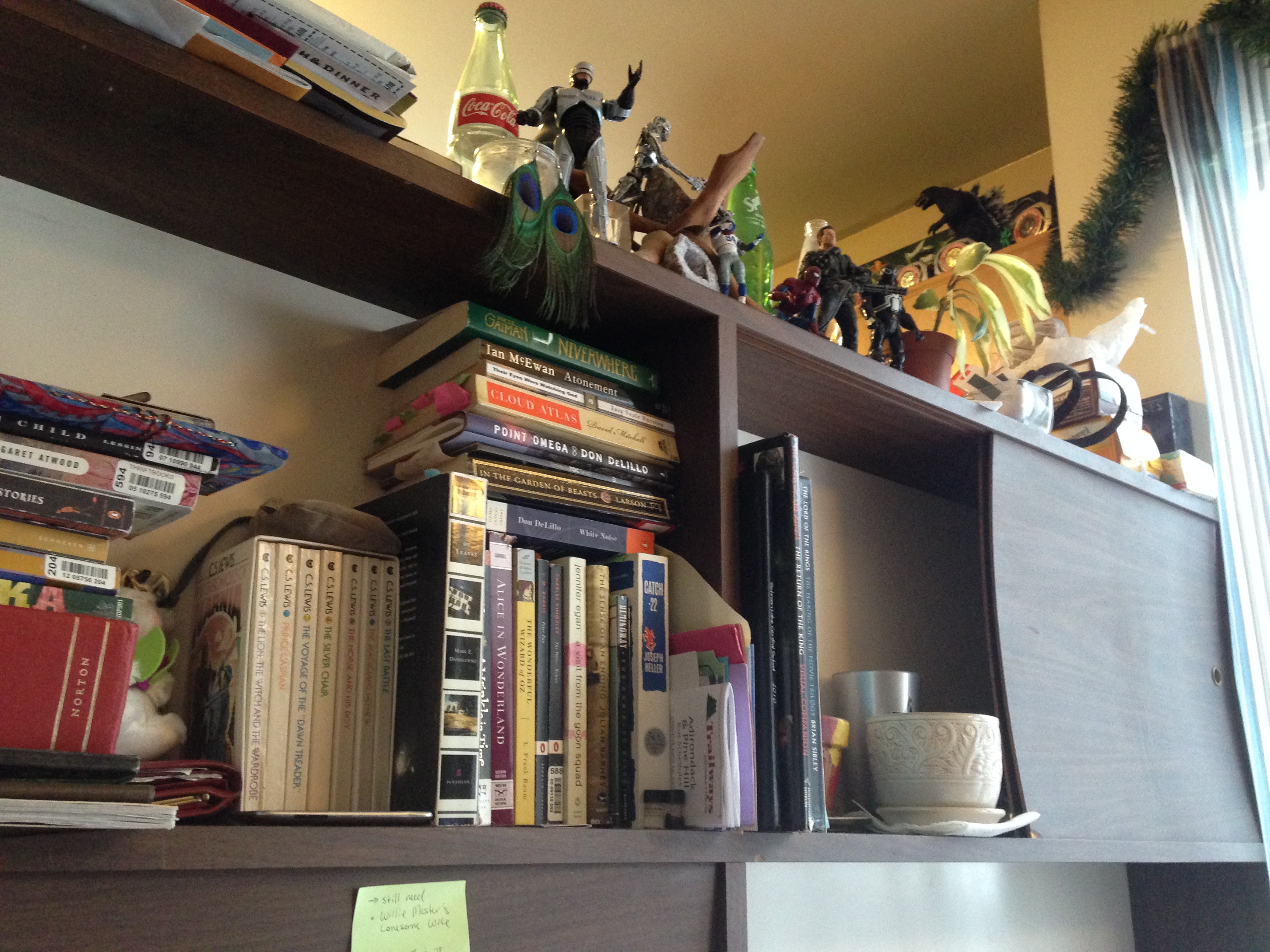 Everything you need at arms length…accept the fridge. The Chronicles of Narnia box set is right above the green sticky note. Next to it is House of Leaves. Cloud Atlas (orange and beige spine) is stacked horizontally.