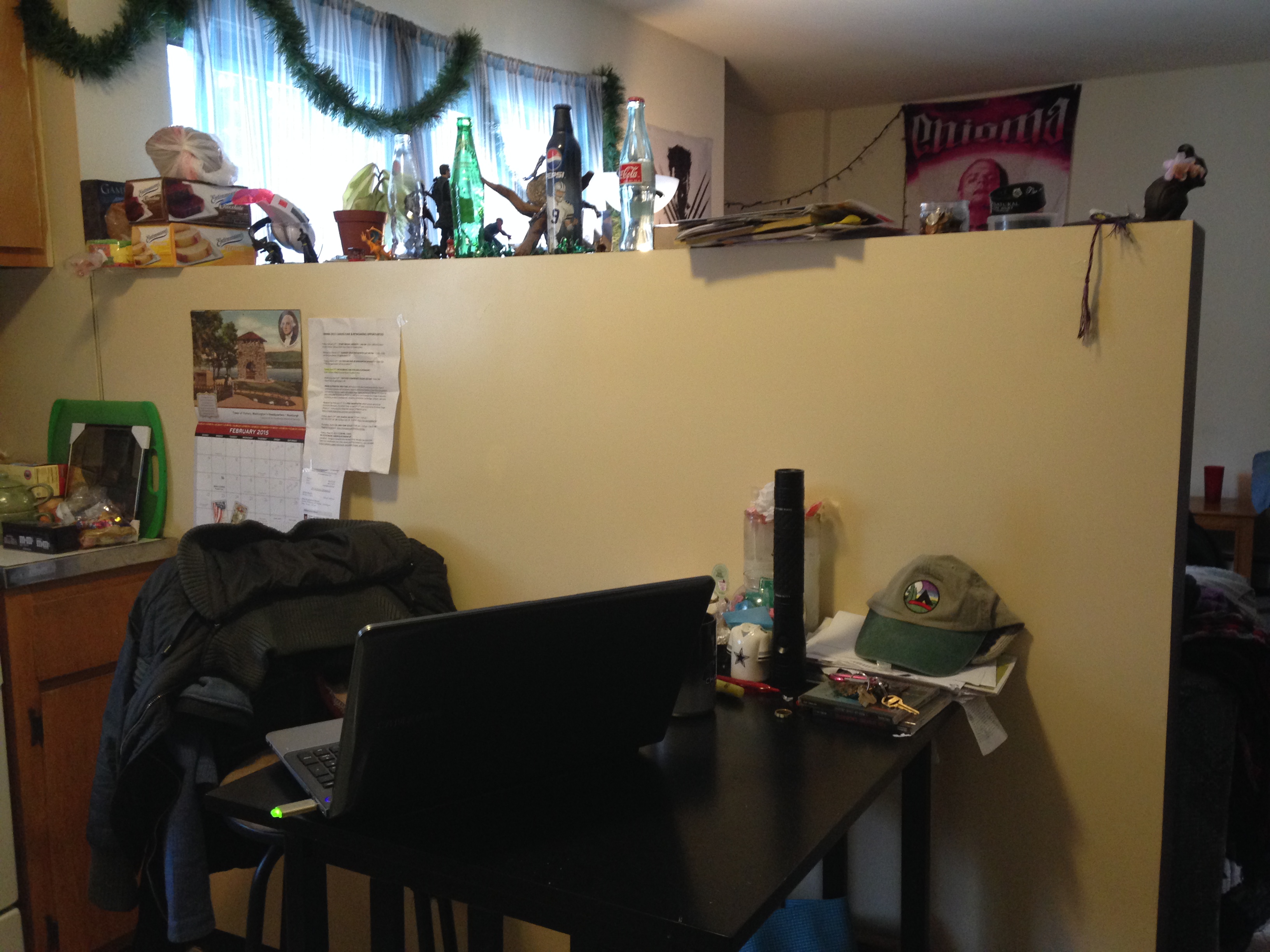 The bookcase is also the clearest indicator of my presence in the apartment.  The three cubbies on the right contain most my books (I have many and was forced to leave some at my parent’s house). It is a blend of past textbooks, childhood favorites, and current interests. The textbooks (almost all having to do with literature and language) are certain to give me away as an English student while the rest of my collection will reveal a penchant for science fiction and contemporary literature. I have not categorized them in any ostensible way (The Chronicles of Narnia sit next to the brain-teasing metafiction novel House of Leaves on the top shelf. David Mitchell’s Ghostwritten is not next to Cloud Atlas, but down next to my dictionary and anthology on literary criticism on the middle shelf), and if someone were to glance at them they would probably conclude that I am not very organized. While this is a little bit true, the books do, in fact, have a method behind their madness. The ones that I refer to the most often occupy the top and middle shelves while those that I refer to less often are located on the bottom. I call this organizational scheme the Arm Chair System as the texts I need the most are within easy reach from the armchair located, conveniently, right next to the shelves. The middle right shelf also hosts my various notebooks, sticky notes, and a pen holder that holds a plethora of ballpoint pens and wooden pencils as well as a couple of highlighters (yellow). It is difficult for me to guess what someone might think of me looking at my books. Likely, my love of language and narrative will be clear. Perhaps they might guess at my appreciation for the fantastic and the unexpected, and my desire to push on and find new forms and make new connections. Perhaps, they would get nothing of the sort. I am too close to see myself.