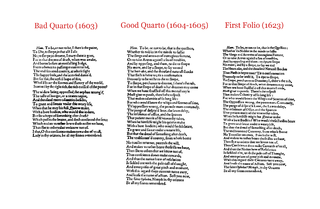 The First Quarto is also known as the “Bad” Quarto. Q1 has 2,200 lines while Q2 (printed just a year later) has 3,800 lines. What’s in a name… would this Quarto by any other name still be so “Bad?” The first thing we know is that lines are being added, which means that some sort of purposeful addition is going on.