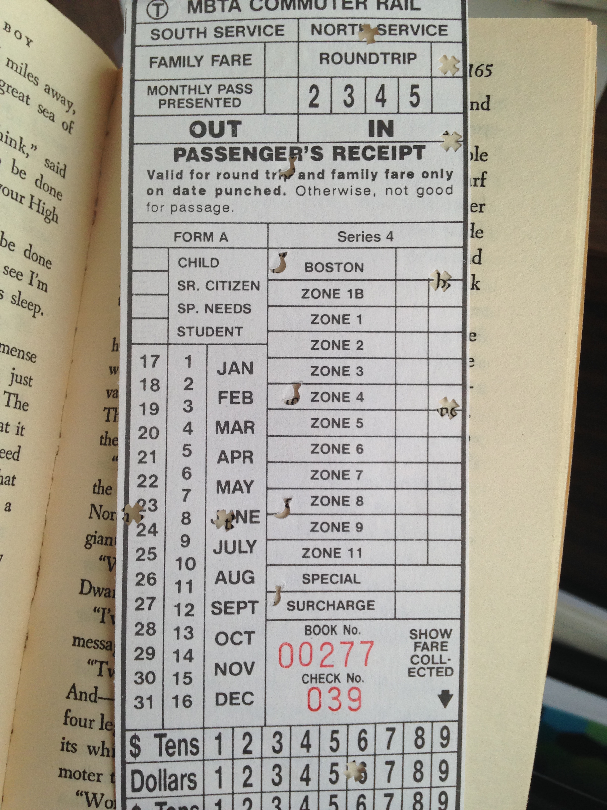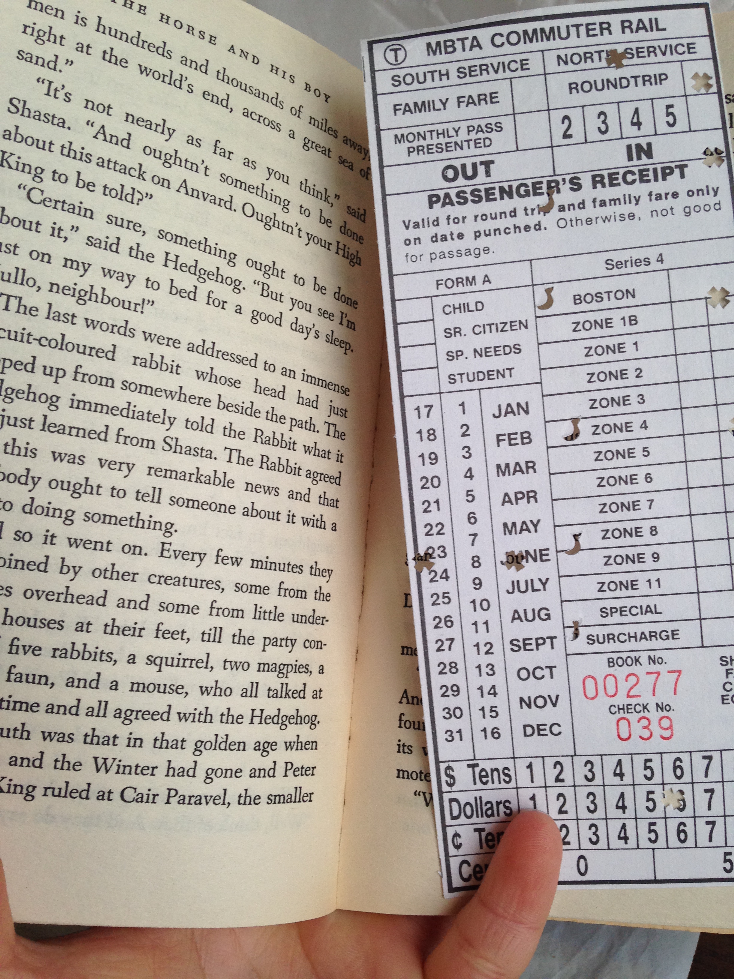 The set has certainly seen better days. The box is light shelf wear, particularly noticeable on the corners. One can see from the crinkling of the spines of the books that the glue that holds the paperboard binding together is beginning to degrade. At some point during its time in my backpack during the fall semester, the front cover of The Lion, the Witch, and the Wardrobe began to fall off. I have yet to take my sticky notes back out. In spite of some patches of wear and tear, the collection as a whole is still pretty hardy. In addition, the books themselves are compact and lightweight enough that they can easily be transported to be read on a trip. One of the previous owners seems to have done exactly that, leaving a Massachusetts Bay Transportation ticket tucked in between the pages of The Horse and His Boy. It is a round trip ticket for a day trip to Boston stamped June 23. Thrilled to find another ticket, I tried to track down the exact route this anonymous reader had taken, but I honestly believe that the MBTA is even more oblique than my own murky family history.
