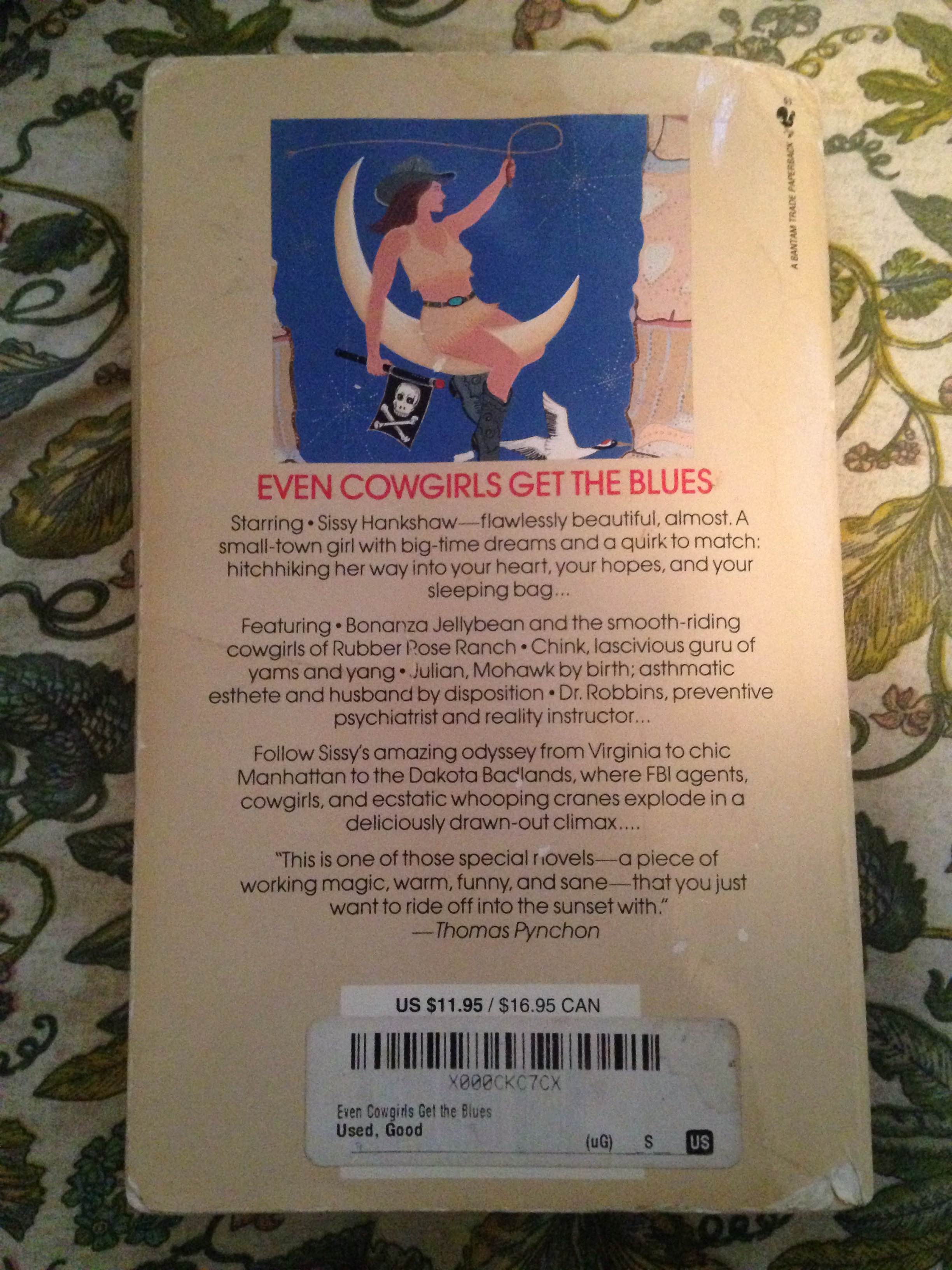 This particular book was purchased at Barner. It sits on my bookshelf beside my collection of other used books, and I think the last time I took it off the shelf was when it was sunny and I could lay in the grass by the pond on campus reading it. Even Cowgirls Get the Blues by Tom Robbins is one of my favorite books, which might be weird to say about a book I haven’t quite yet finished. There is a dog-eared page on page 261 and I think that’s where I left off. Creases on the corners of pages can be seen throughout the novel, indicating that I definitely took my time while reading Robbin’s writing. The book is in fairly good condition for a used book, and penciled in on the front page is the price whoever working at Barner set, a scribbled 8, which barely looks like a number and could easily fade away or be written over or erased. The novel must have been bought used by somebody before it was sold to Barner because it had a used barcode sticker on the back cover. The initial price of the book was $11.95, so I guess I didn’t save as much money as I probably could have on this used book. The binding is extremely creased and a little bit torn on the bottom. The front cover is actually missing it’s bottom right corner, almost like it was folded and then ripped off. Other than the slight tearing and creased pages, the pages aren’t too yellowed and I would still call this book “in good condition”. I will just be more careful when I decide to finish the story in hopes that the front cover doesn’t fall off.