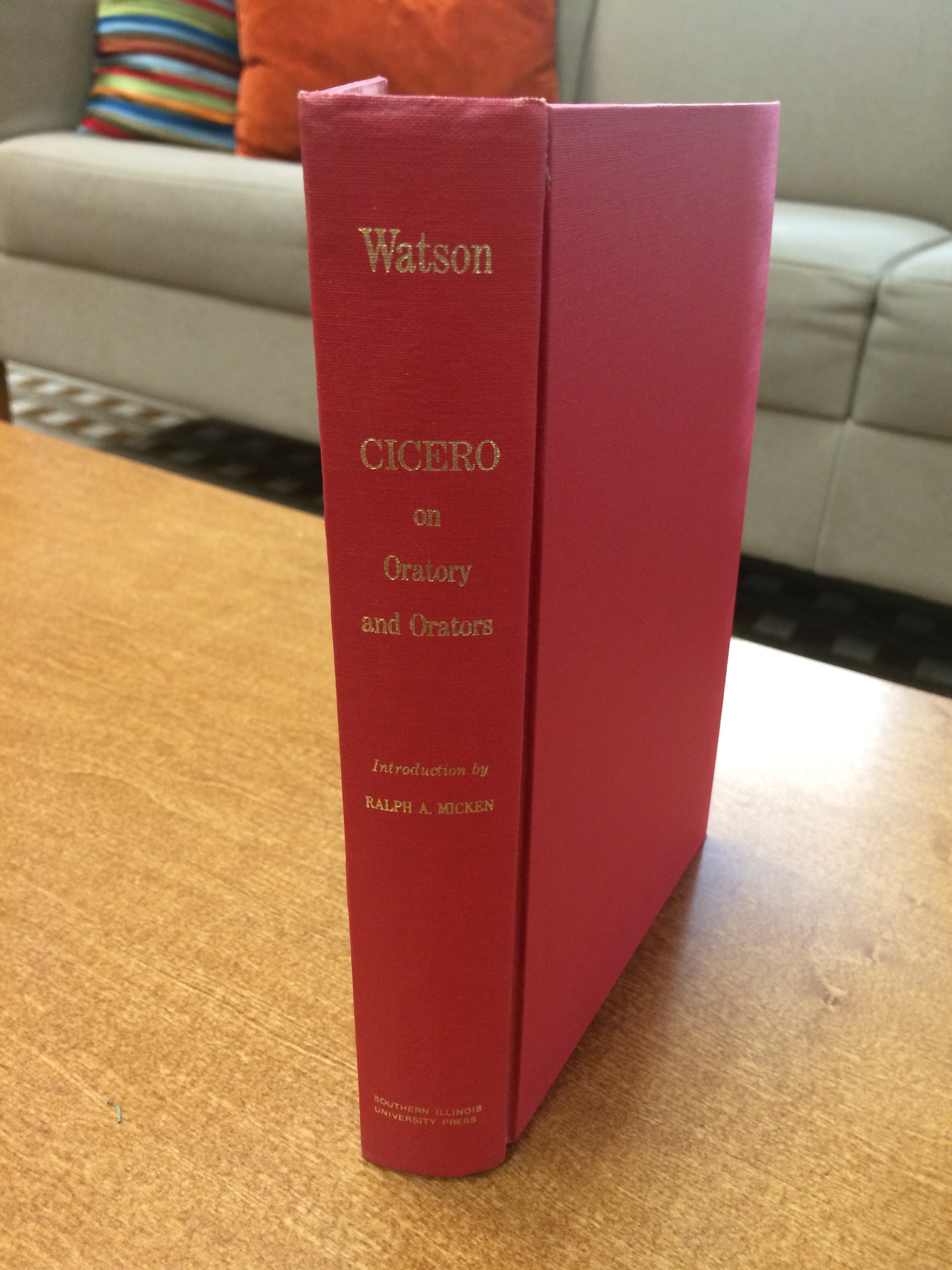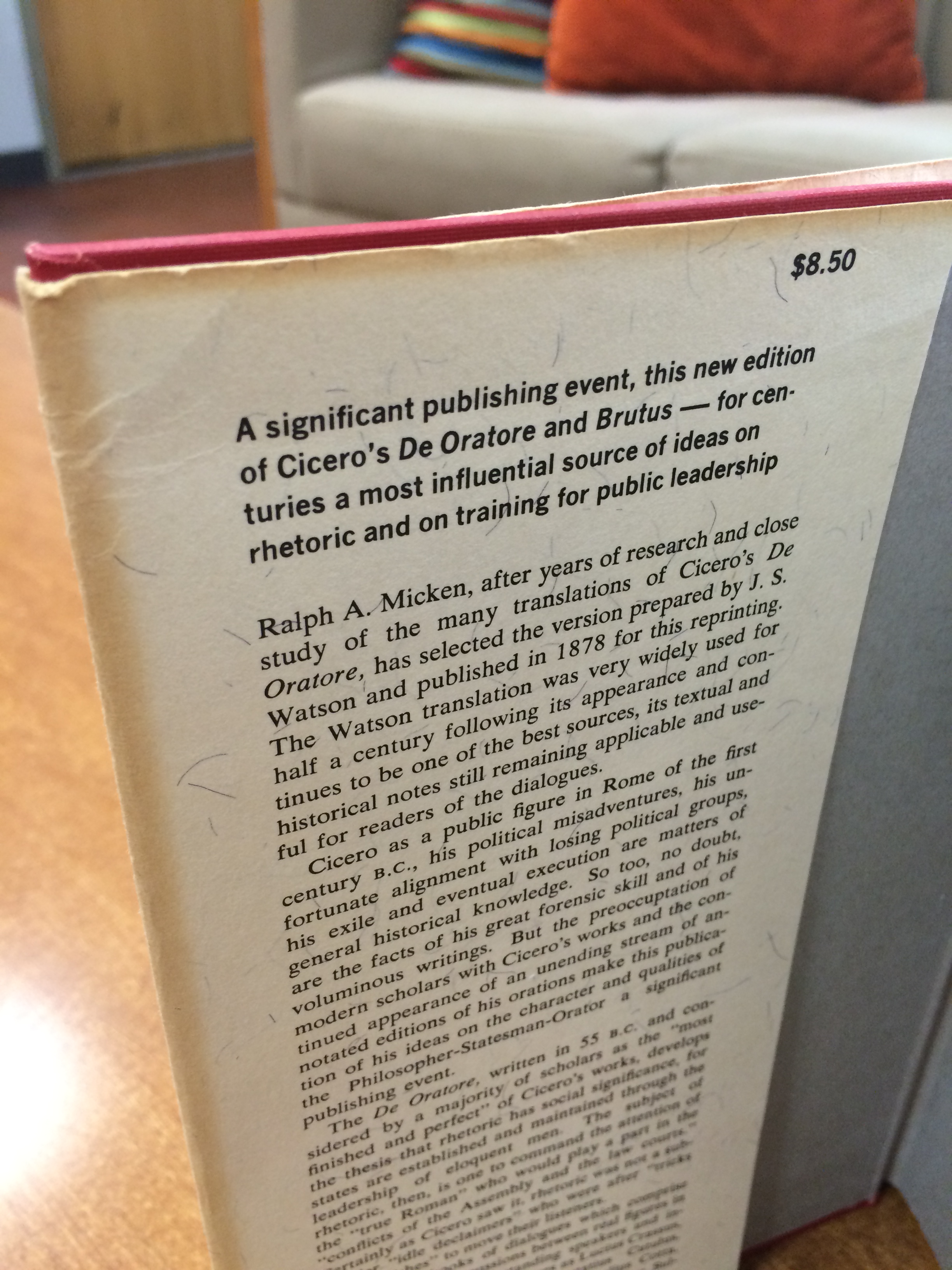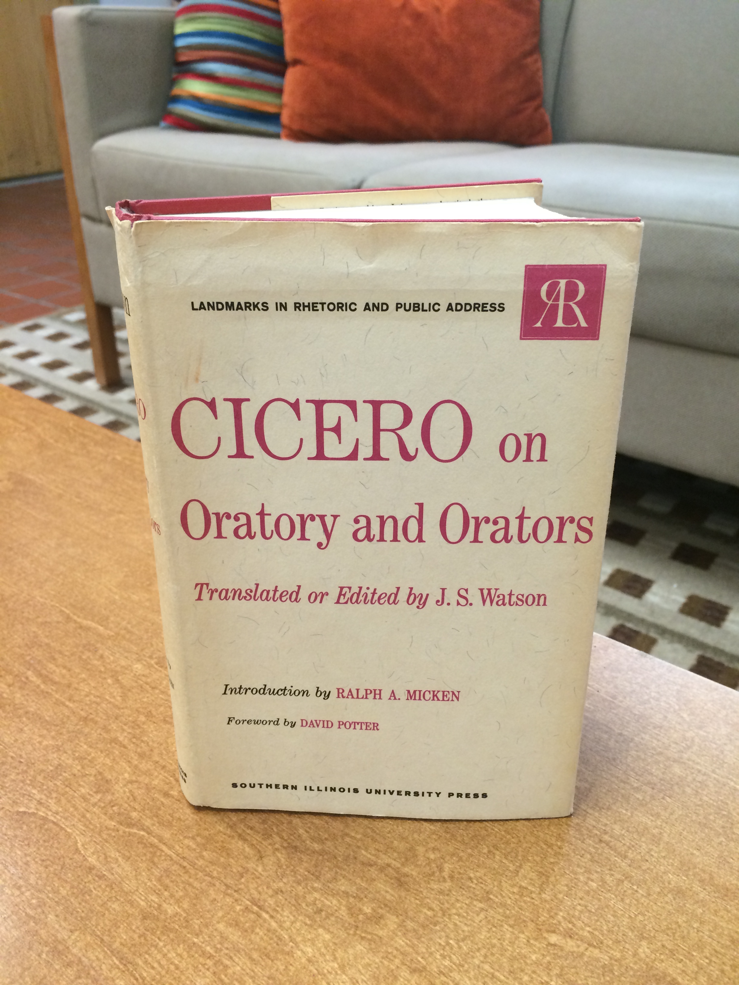 of the paper cover introduces the text as “a significant publishing event”. Ralph A. Micken, was a professor of Speech and Chairman of the Department of the Southern Illinois University, wrote the introduction for this particular text. The back flap of the cover informed me that Micken lectured on Cicero for over 30 years and completed extensive research at the British Museum and British Universities, reviewing manuscripts of Cicero’s De Oratore. I learned that J.S. Watson prepared and published this edition of the text in 1878 and it was Micken who selected this edition for reprinting as it is considered one of the best translated versions with its textual and historical notes made by Watson. The preface to the text is by J.S. Watson from his original publication where he credits the work of George Barnes, a Barrister of the Inner Temple, whose translation of De Oratore in 1762 provided the ground for Watson’s further translation.