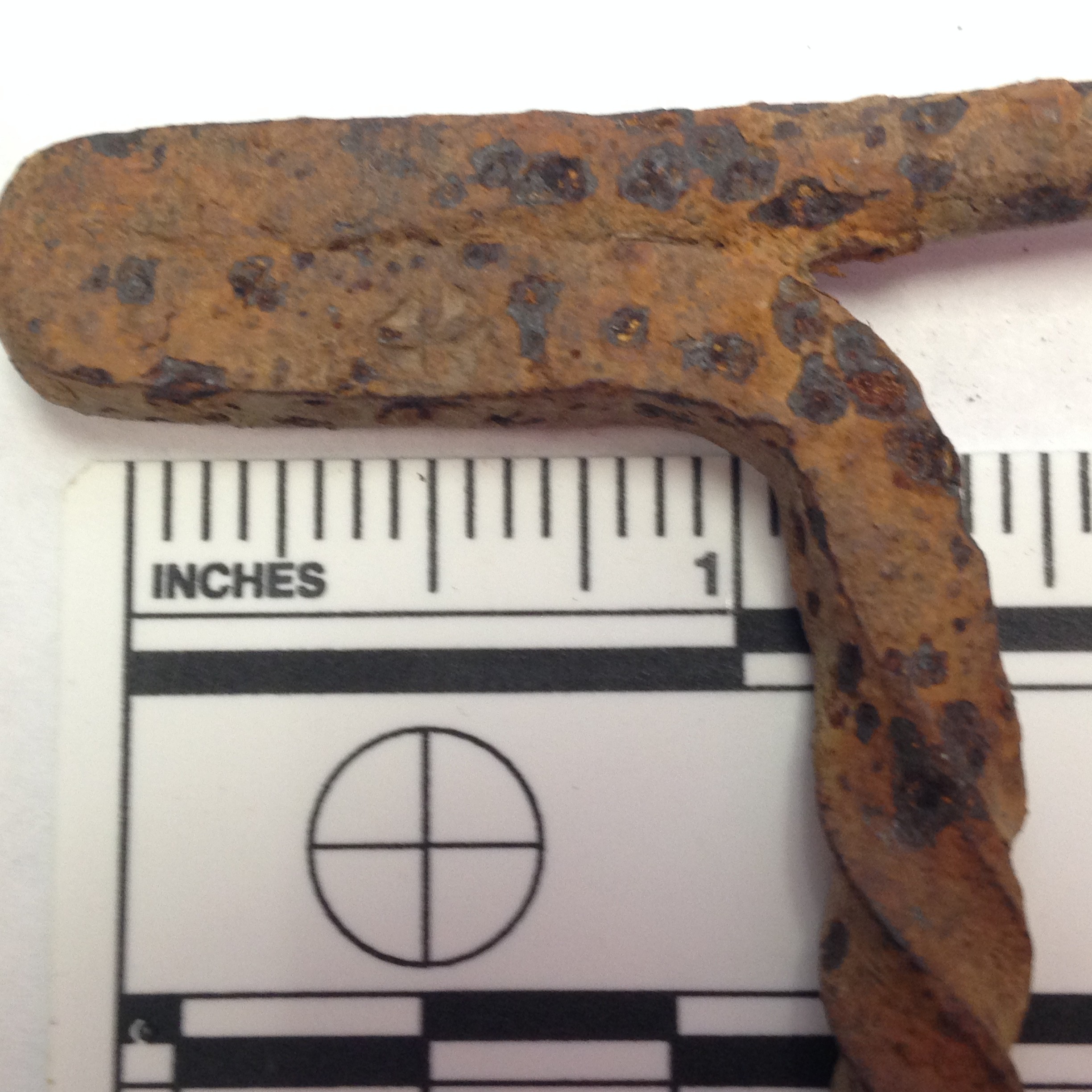 Roughly three and a quarter inches long and three inches at its widest point, the iron object resembles a rusty capital “T.” A close inspection of the wide bar indicates that the object was formed by hammering a single piece of iron into shape, making one end of the bar a little thicker than the other. It also reveals a small maker’s mark on one side, a little cross engraved into a circle, so small it is almost lost in the rust. Extending perpendicularly from the wide bar is a long shaft that spirals into a long flat point similar to the tip of a flat head screwdriver. The similarity has raised the possibility that the object is an unusual but well-crafted screwdriver. However, the spiral of the shaft and the delicate taper of the wide bar also resemble the decorative elements found on wrought iron shutter fasteners. Attempts to establish a more concrete identity for the object have been foiled by its sheer uniqueness.