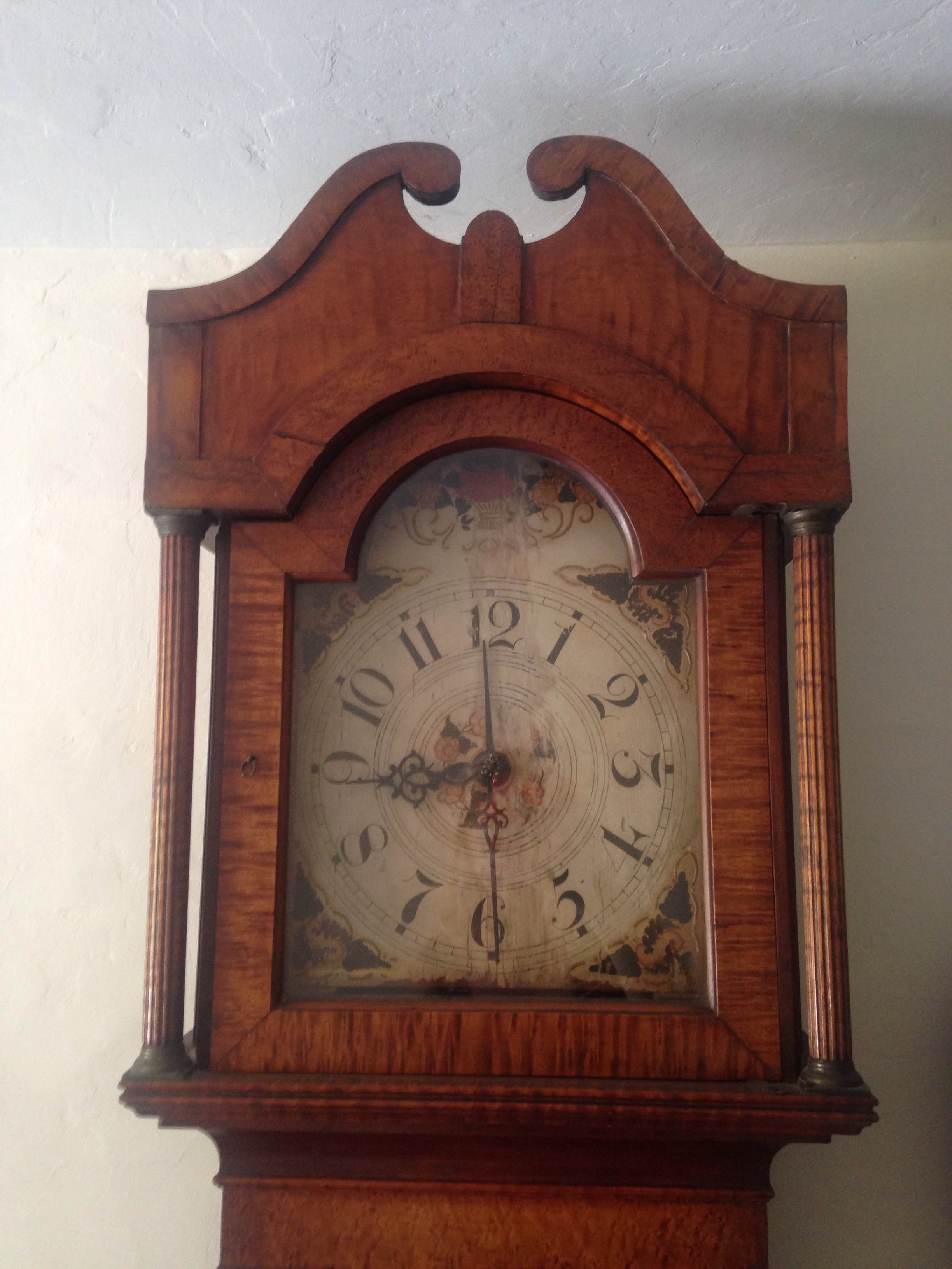 Physical Description: The grandfather clock is about eight feet tall and it’s casing is composed of Tiger Maple wood. Tiger Maple wood is commonly referred to by many different names such as flamed maple, curly maple, ripple maple, fiddleback or tiger stripe. These names are derived from how the wood looks: the growth of the wood fibers is distorted in an undulating chatoyant (cat-eye) pattern, producing wavy lines known as “flames”. This type of wood is known for it’s beauty and is often used in making instruments. This clock’s wood is very noticeably striped and stained a golden hue. The face of the clock is white with a red, yellow, and green flower design and black numbers. According to Huguenot Street’s file, it once could have been a “Wag on Wall” clock – meaning before it was a grandfather clock, it did not have a base and the face of the clock probably hung on a wall on it’s own at one point. It is also said to have been reconverted from an electric clock, and while it looks like it is in good condition it has been repaired several times.