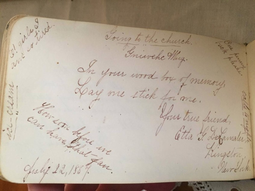 18297165_1572357219441834_444207819_o Published May 5, 2017 at 1333 × 1000 in Gertrude M. Deyo’s Autograph Book Etta’s written side of a dialogue between Gertrude and her friend Etta, possibly while they are sitting in church, 1887