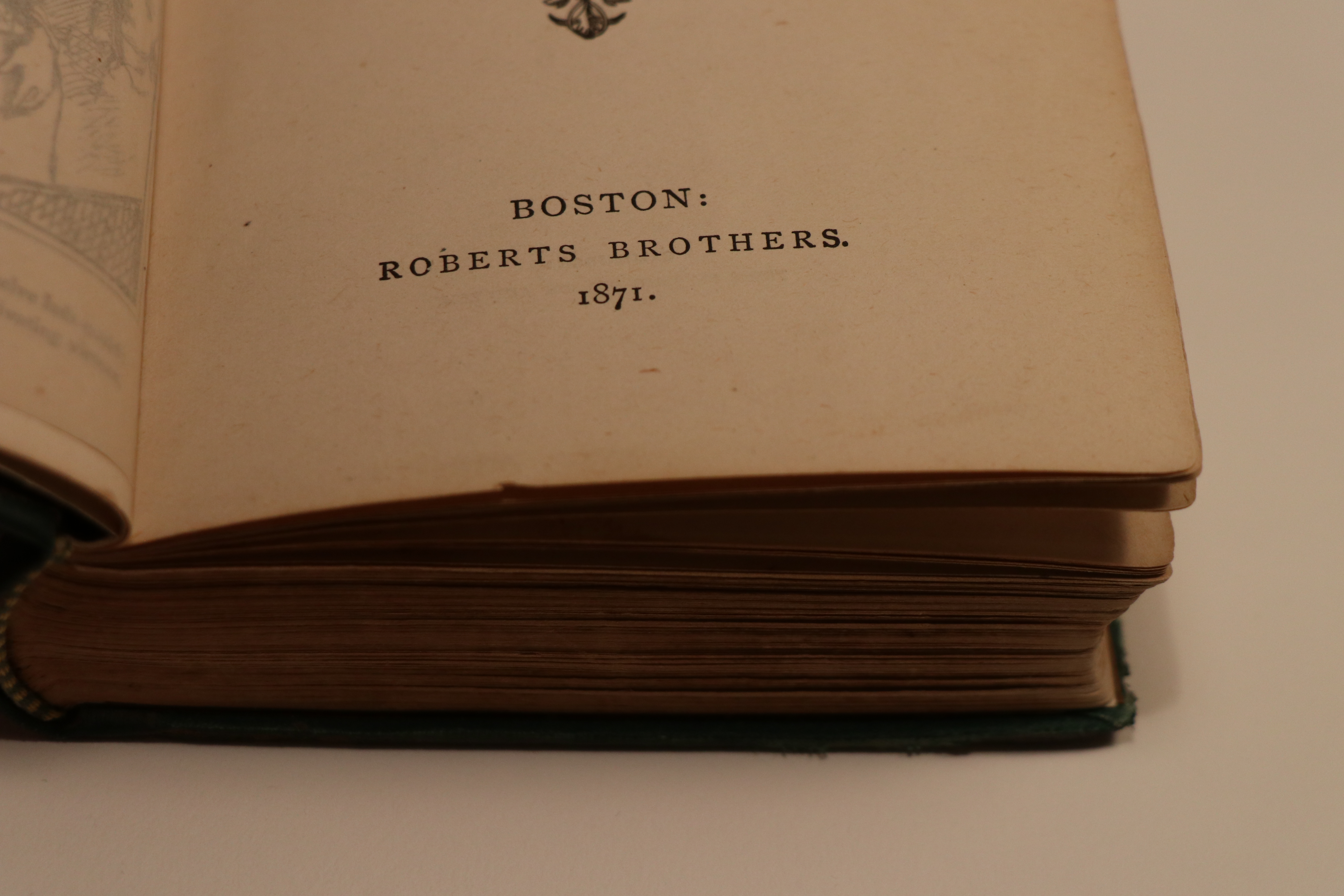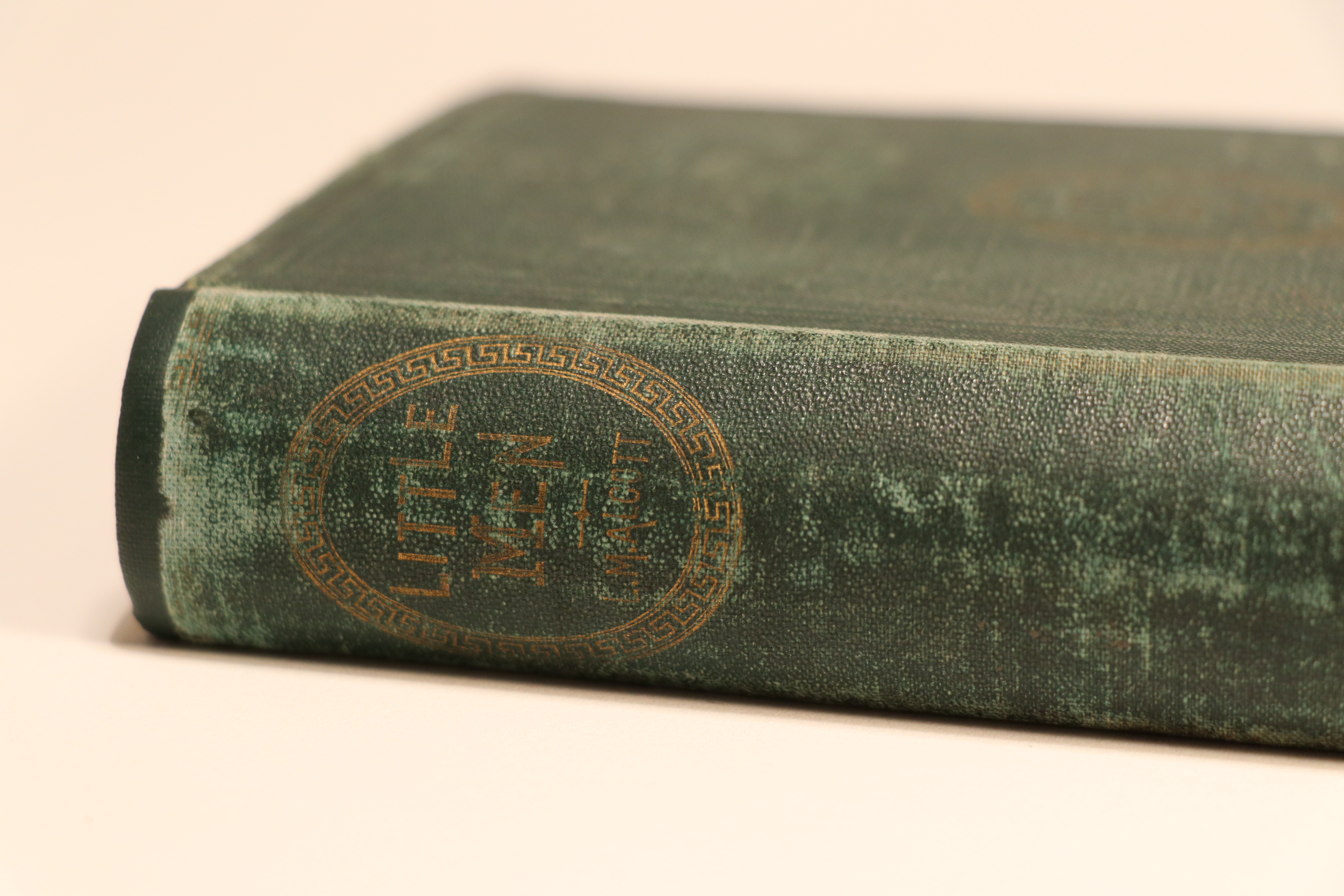 The object I have chosen to describe is my first edition copy of Little Men by Louisa May Alcott. My fascination with her novels and life started in sixth grade when I first read Little Women. I then started collecting nineteenth century editions of her books, many of which have come from New England–including her hometown–though some have even been sent to me from family in the South. This specific edition was printed in 1871 under the full title Little Men: Life at Plumfield with Jo’s Boy’s, making it the second oldest book in my collection. However, this book holds a special significance in that it is also one of my favorite stories in my collection. Additionally, it is of the same author and publishing company as most of my collection–the Roberts Brothers, located in Boston, Massachusetts. The book is five inches wide, six and three quarters inches tall, and one and one quarter inches thick, with 376 pages in total. It is a green clothbound book, though there were also purple and terra cotta books released in the first edition printing. Unfortunately, I do not remember where I acquired this specific book as I currently have 20 titles by Alcott, 12 of them under the Roberts Brothers publication.