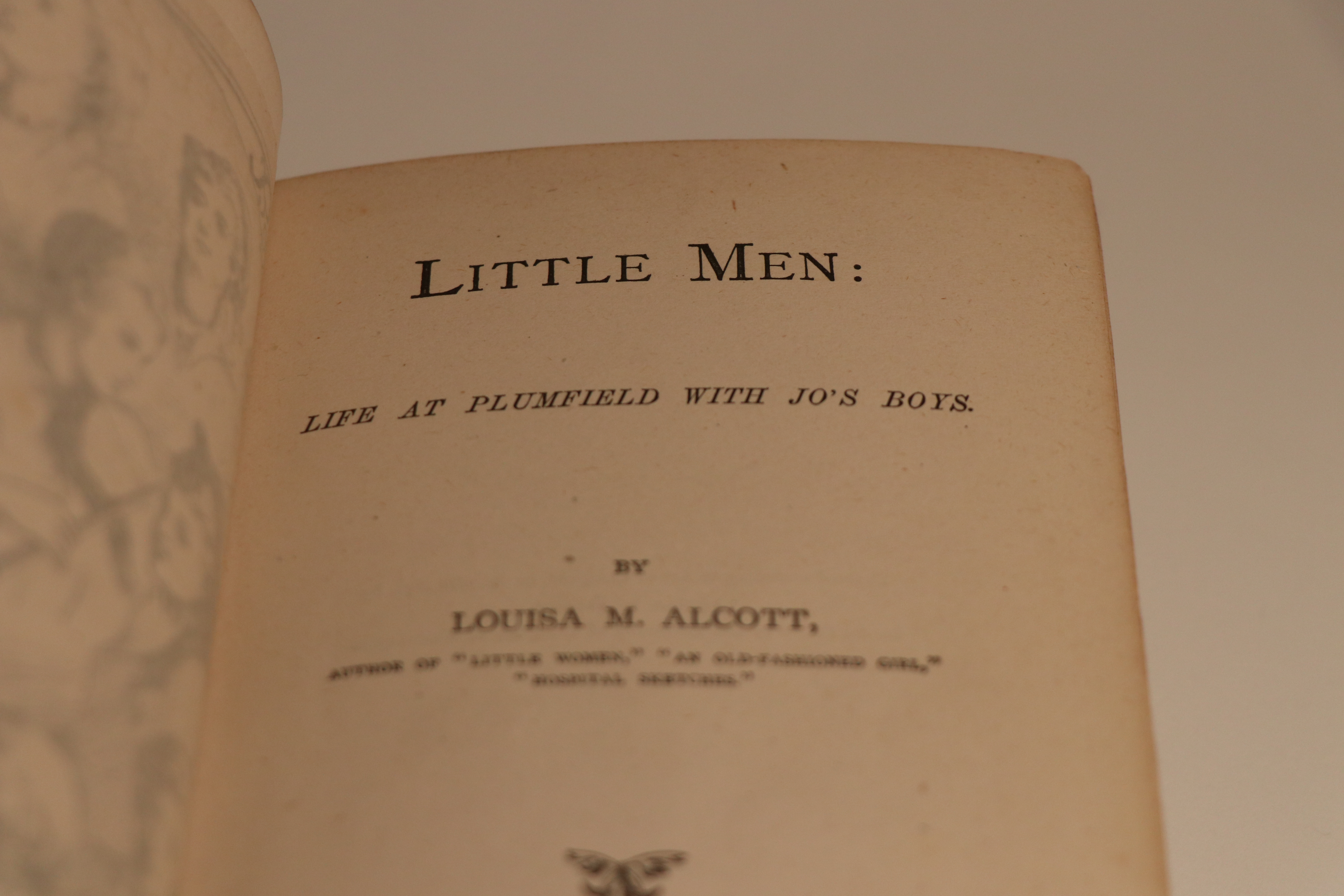 Little Men is the second book of Louisa May Alcott’s (unofficial) trilogy, proceeded by Little Women and followed by Jo’s Boys. The narrative follows Jo and Friedrich Bhaer’s life at Plumfield Estate School where they raise and school a grouping of children–both those in the family as well as orphans. This specific edition has only one illustration found opposite the title page, which gives a portrait of each of the characters introduced in the novel.