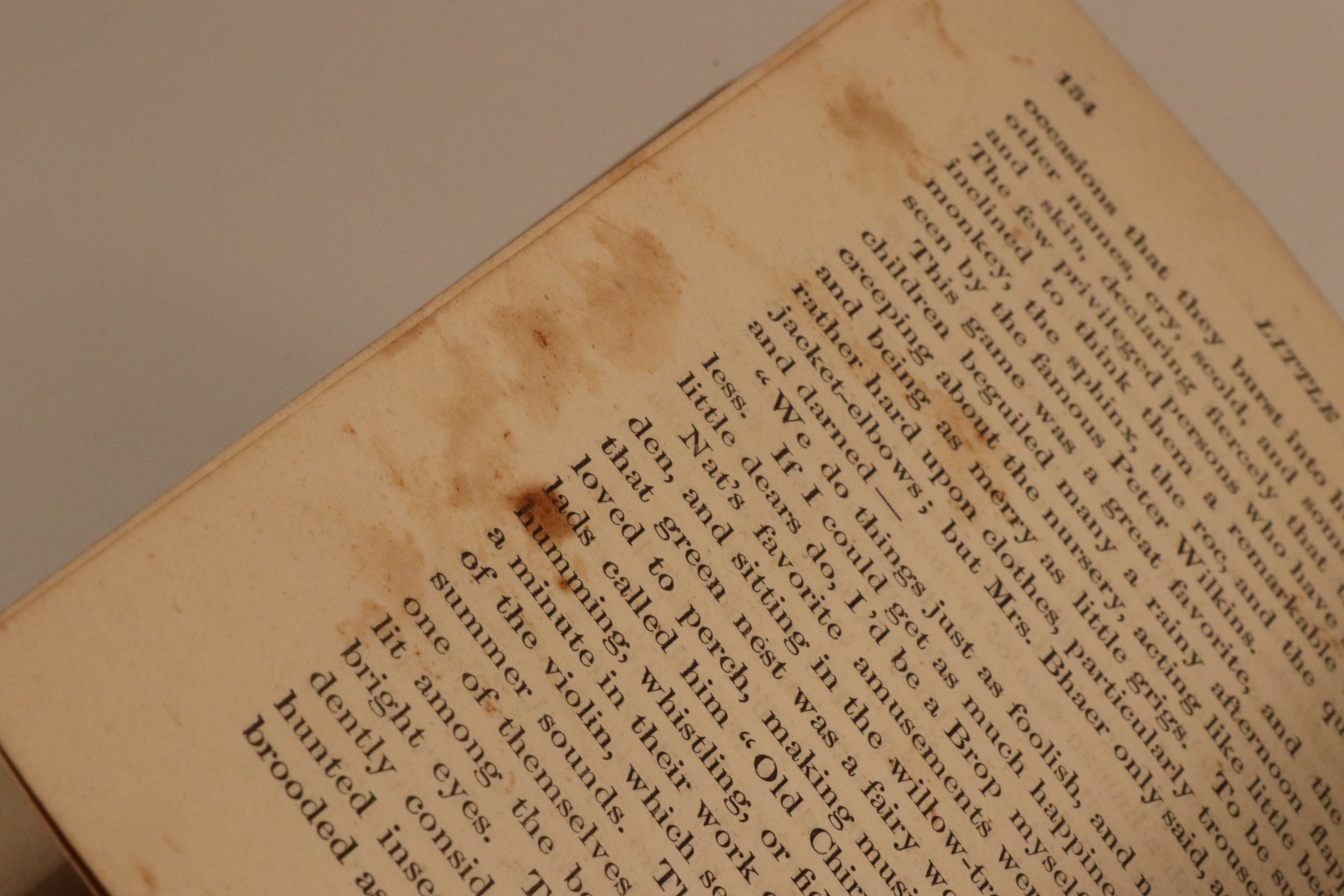 While my book collection does not consist of 19th century classics, I do appreciate your dedication towards acquiring novels written by Louisa May. It’s truly remarkable to see how the binding is still in great condition, considering some of the books I own, which have been printed within the last twenty-five years, are falling apart because the spine of the book is collapsing. Additionally, when I file through assignments from last semester, I’ll find printed items where the ink has already faded, so it’s incredible how the ink appears to have kept a fresh look over the course of its one-hundred-and-fifty-year life span. I also found it fascinating how you prefer to see a little wear and tear in the books you collect. I never thought about each stain, tear, or pencil marking from another owner to describe the book’s own history. When I think about it that way, it adds a whole other element to a book’s value. Well done!