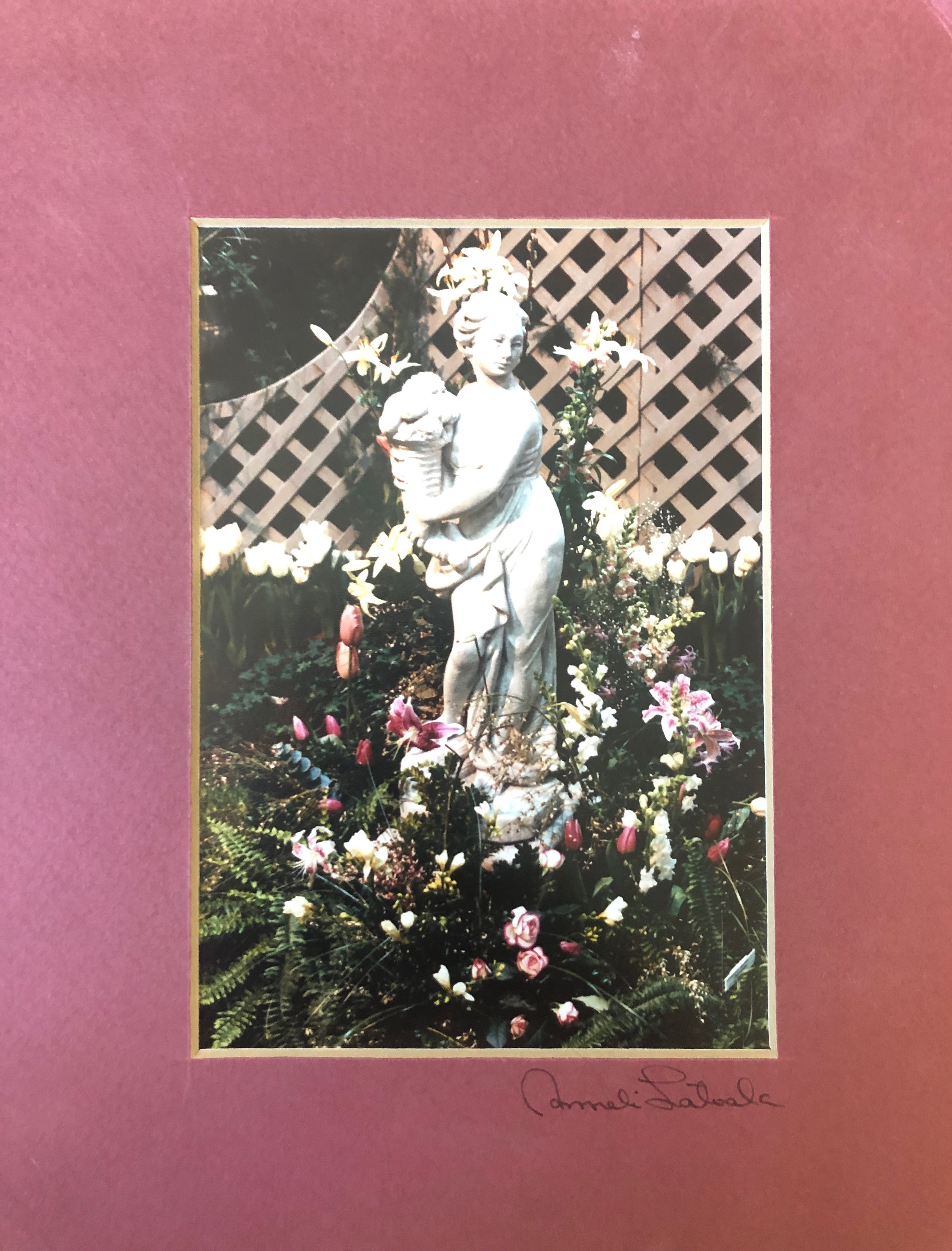 I love this picture so much, because of the aesthetic of it. The colors in the flower are bright and beautiful, yet still subdued hues and match the color of the matte board almost perfectly. The statue is holding what looks like a cornucopia of produce, and she seems to be cradling it as one holds a child. All the little details in her appearance make me love this photograph so much; the waves in her hair, the folding of her dress, and how it wraps around her, and how the placement of this statue is so strategic, the flowers in this garden seem to dance, sway, and grow every which way around her.