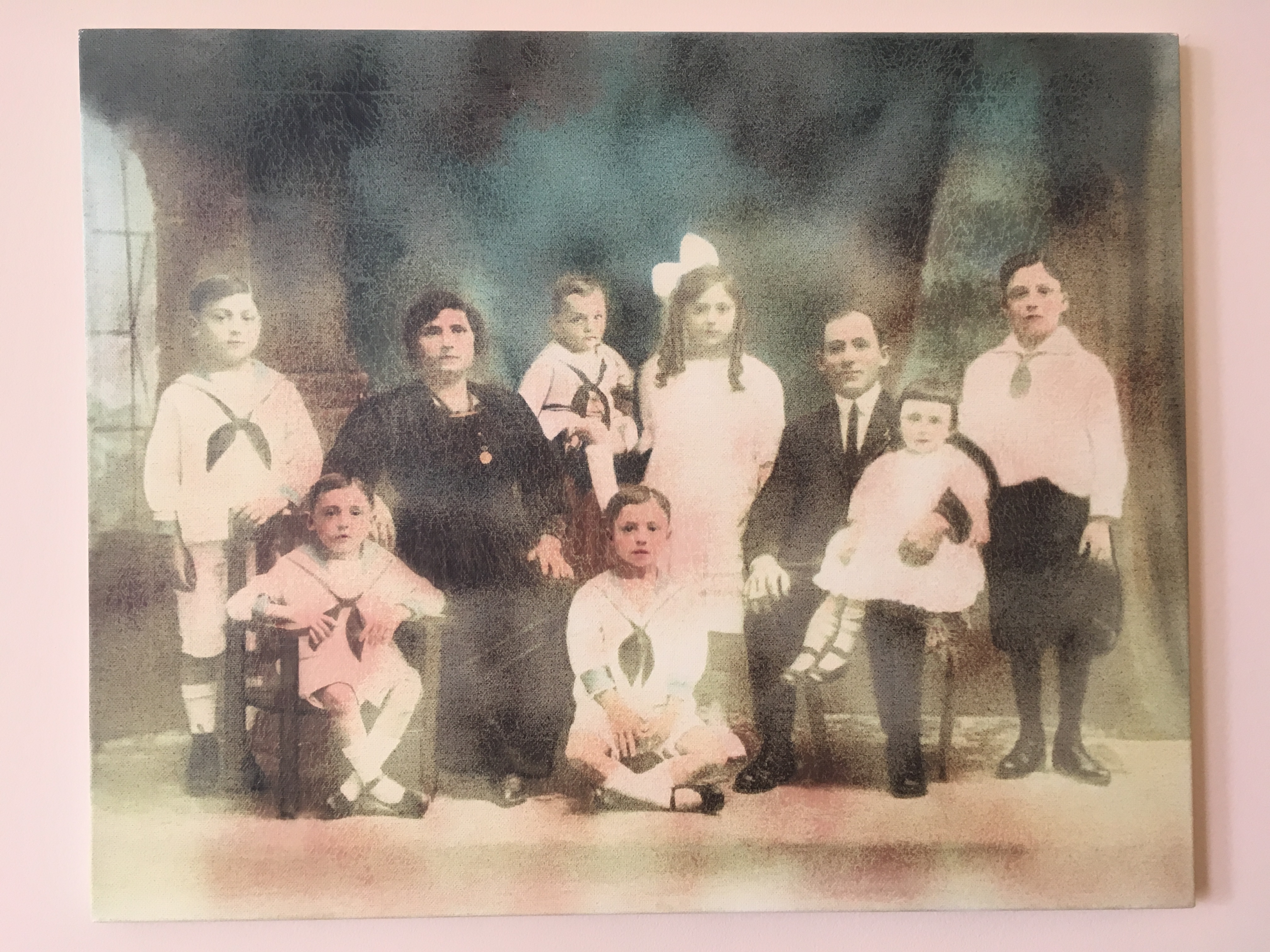 In 2014, after nearly eighty-five years of living in the same apartment building in the Bronx, Auntie Dot moved to an assisted living facility in Westchester County, New York. While I was helping remove furniture from Auntie’s apartment, I noticed behind one of the couches a partially torn canvas with a faded photograph of my family from two generations ago. Presented in Figure 1 is the restored canvas and photograph of my family from nearly one hundred years ago. In all my visits to Auntie Dot’s apartment as a child, I had never seen this family photograph, and after showing my other family members, no one else recognized it either. Auntie Dot, on the other hand, through a verbal description, knew immediately what I was talking about, and began telling me the story of how and why this photograph was taken.