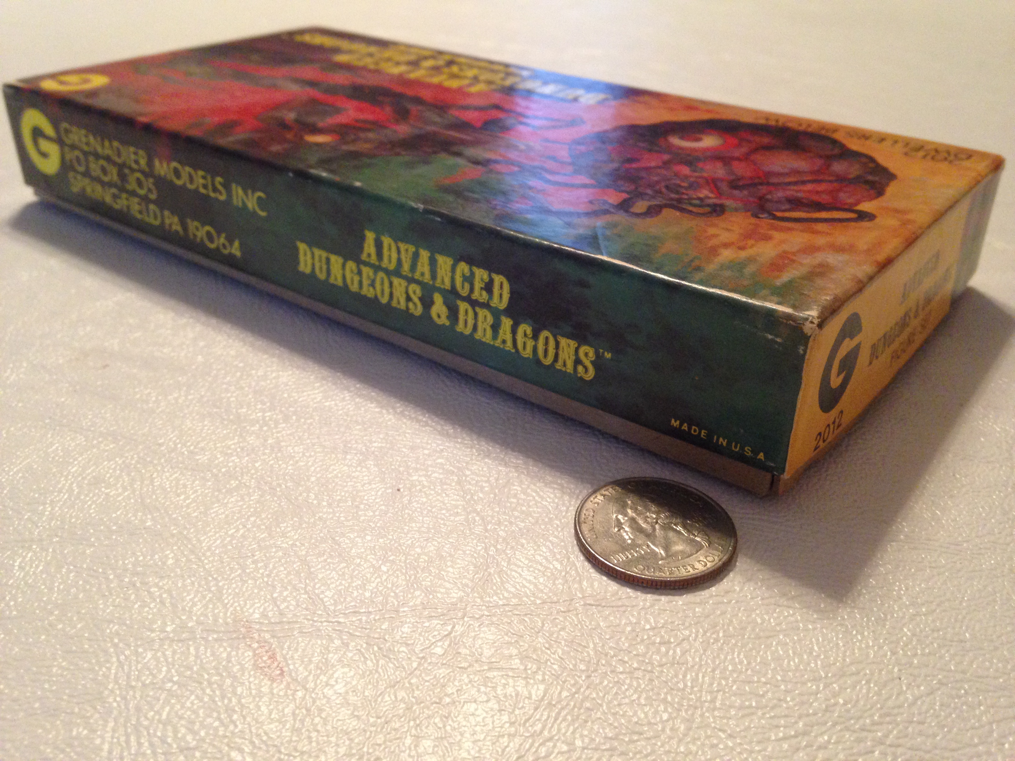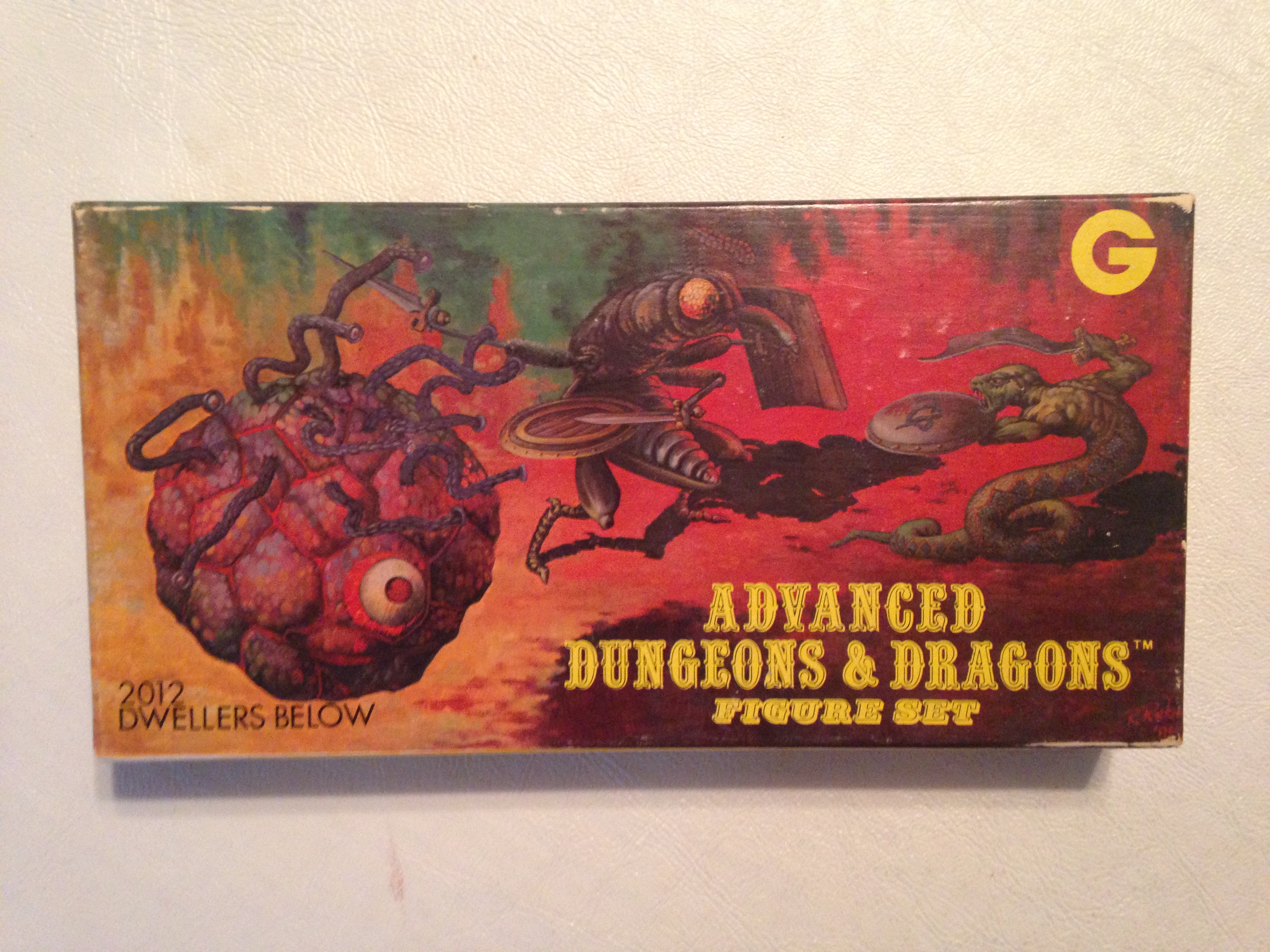 The Advanced Dungeons and Dragons Figure Set clocks in at 8” long by 4” wide and 1” tall, and has on its surface the image of a Beholder, a floating mass of snakes and flesh with a giant eye. He seems to be watching a Fly Man, or Aarakocra, fighting against a Snake Man, called a Yuan Ti. It has a number 2012, placed above the phrase “Dwellers Bellow”, and has two yellow sides with “Advanced Dungeons and Dragons Figure Set ” and two green sides that say “Advanced Dungeons and Dragons ” again, with the company information “Grenadier Models Inc. PO Box 305 Springfield PA 19064, and Made in USA in the bottom right corner. It’s made of cardboard that is beginning to deteriorate at the corners, and has a brow cardboard backing. Inside the box are several figurines kept in rectangle cutouts that are set in blue foam.