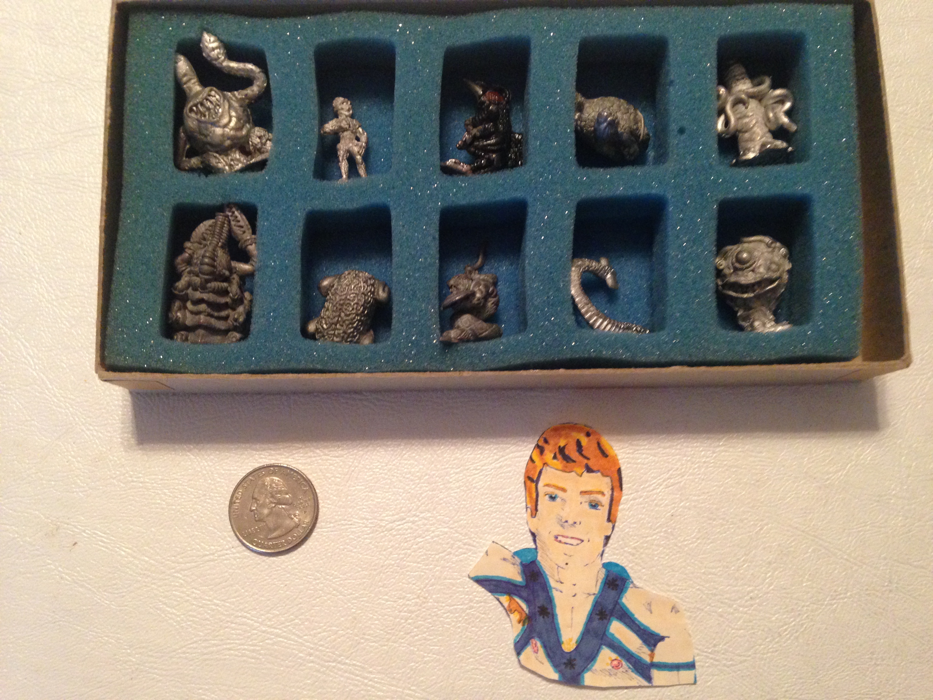 The box is filled with figurines representing various characters and monsters. They are all about as big as a quarter, though the larger ones are almost 1.5” long. In particular, there’s a drawing of a man with red hair, and a painted Aaarakocra with two shields and a sword, along with my favorite monster, the beholder.