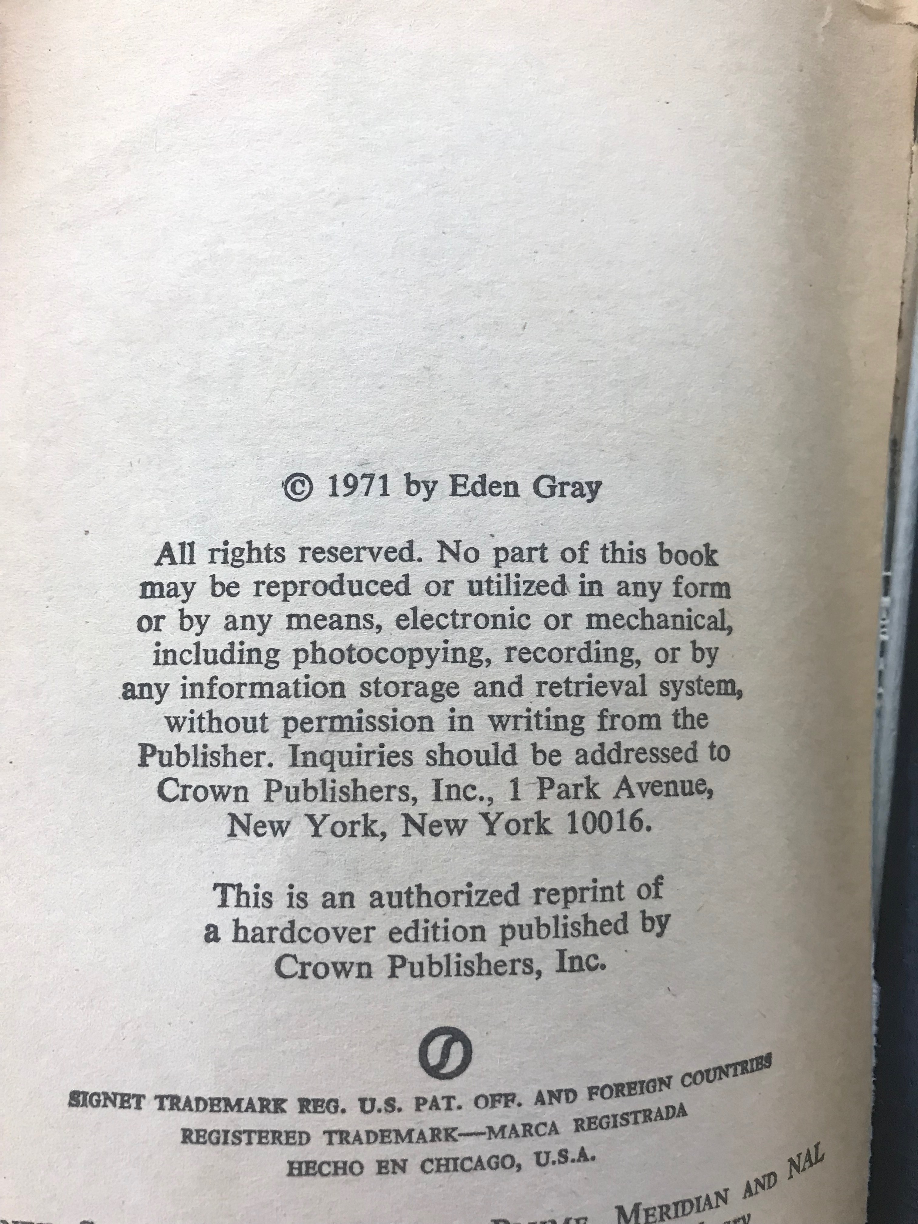 Originally published in 1971, this copy was purchased by my mother in the late 90s at a used bookstore outside of Washington, DC, where I grew up. The neon green price tag reading “McKay Books” remains on the front cover; I spent many afternoons at this bookstore as a kid and have fond memories of purchasing some of my favorite books from there, so I have yet to peel off the price tag after all this time.