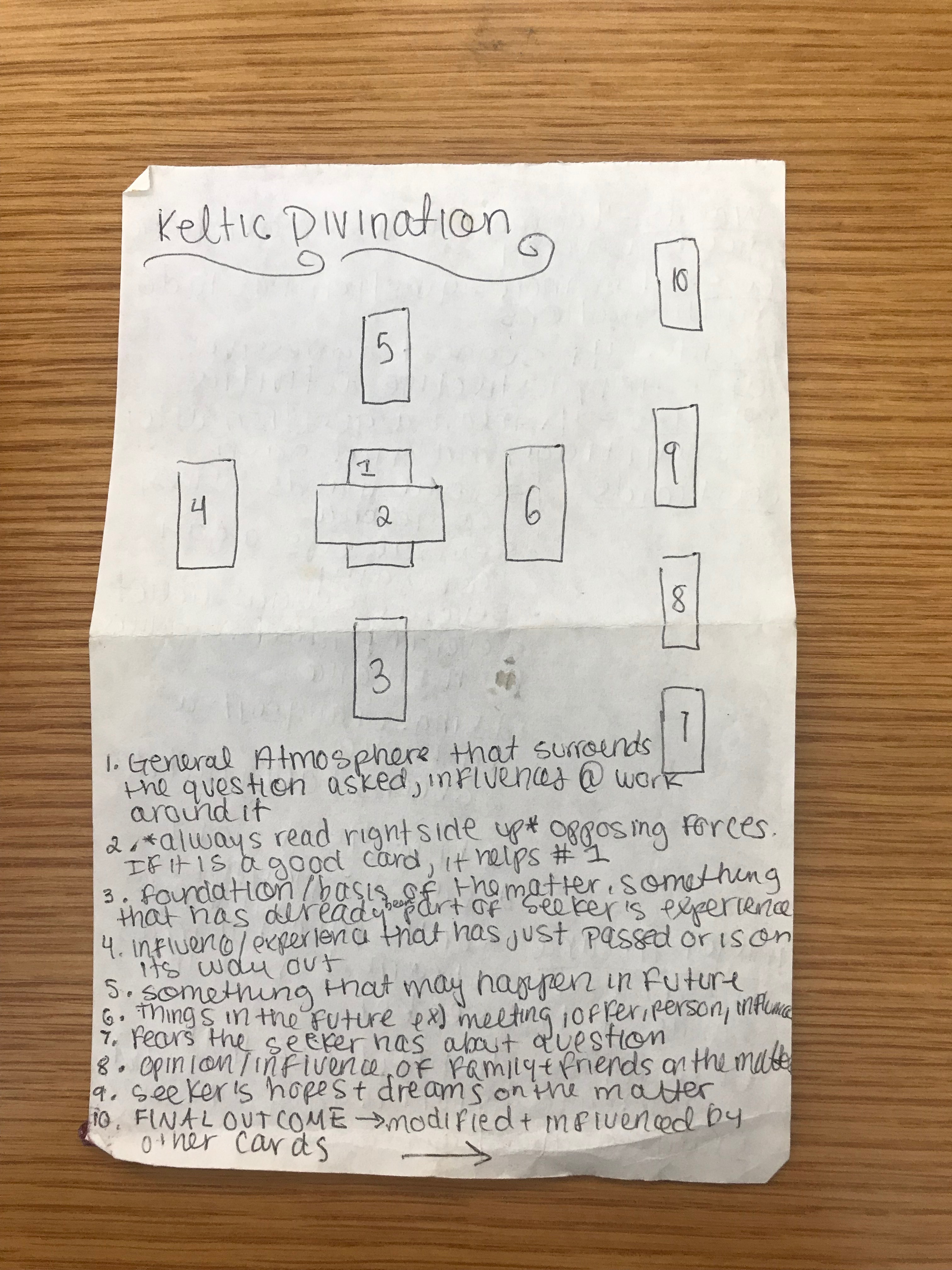 The Keltic (spelled with a K in Tarot lure) Divination method with my personal notes about certain card meanings.