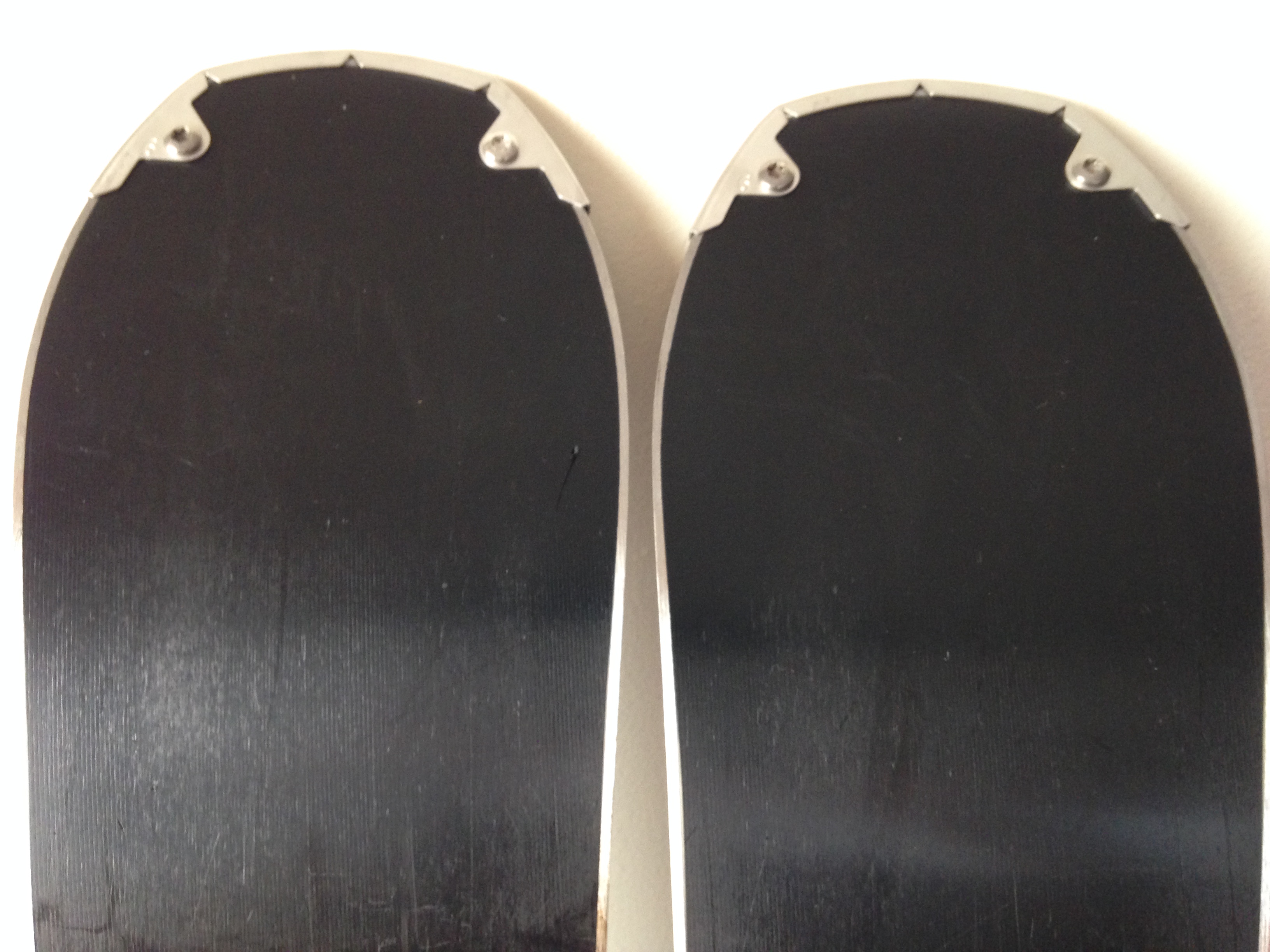 The skis stand 5’5” tall, and taper from a width of 4.5” thick at the top to 3” at the center, back to 4.5” at the bottom, giving them a sort of lanky hourglass shape when looked at head on. At this angle, the tips bend toward the viewer, then curves up slightly again at the center such that it is pressed into the snow by its user’s weight. This type of curve is called a rocker, and both prevents the ski from catching on small elevation changes, while limiting how much the skier’s boot presses into the snow, allowing a smoother glide.