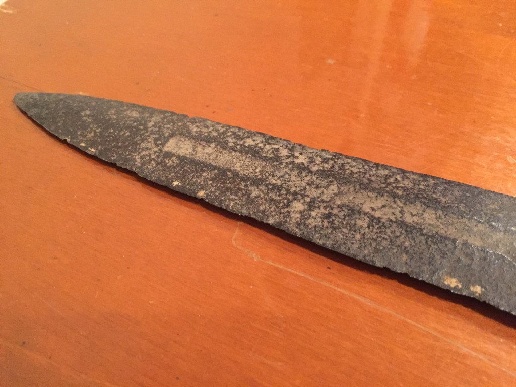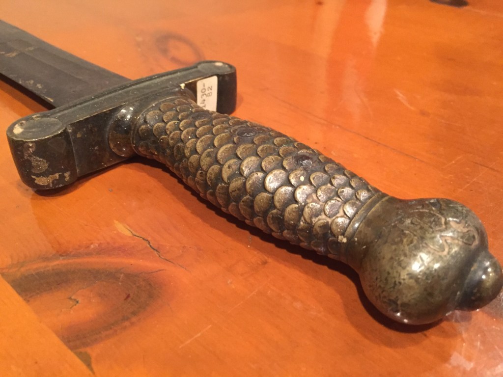 The U.S. model from our collection was a double-edged sword 25 inches long and was 1.75 inches wide. Moreover, the physical steel blade spans 19 inches with a small indent that runs down the middle, all with a corroded metal look due to length of time since its initial creation. Shifting to the lower part of the object, the sword has a 6-inch solid brass hilt and a 4-inch cross guard with a curricular design at each end. In addition, one of the most noticeable features is the fish scale grips that make up the hilt of the sword, along with the spherical pommel at the base of the sword with a faded image of an eagle.