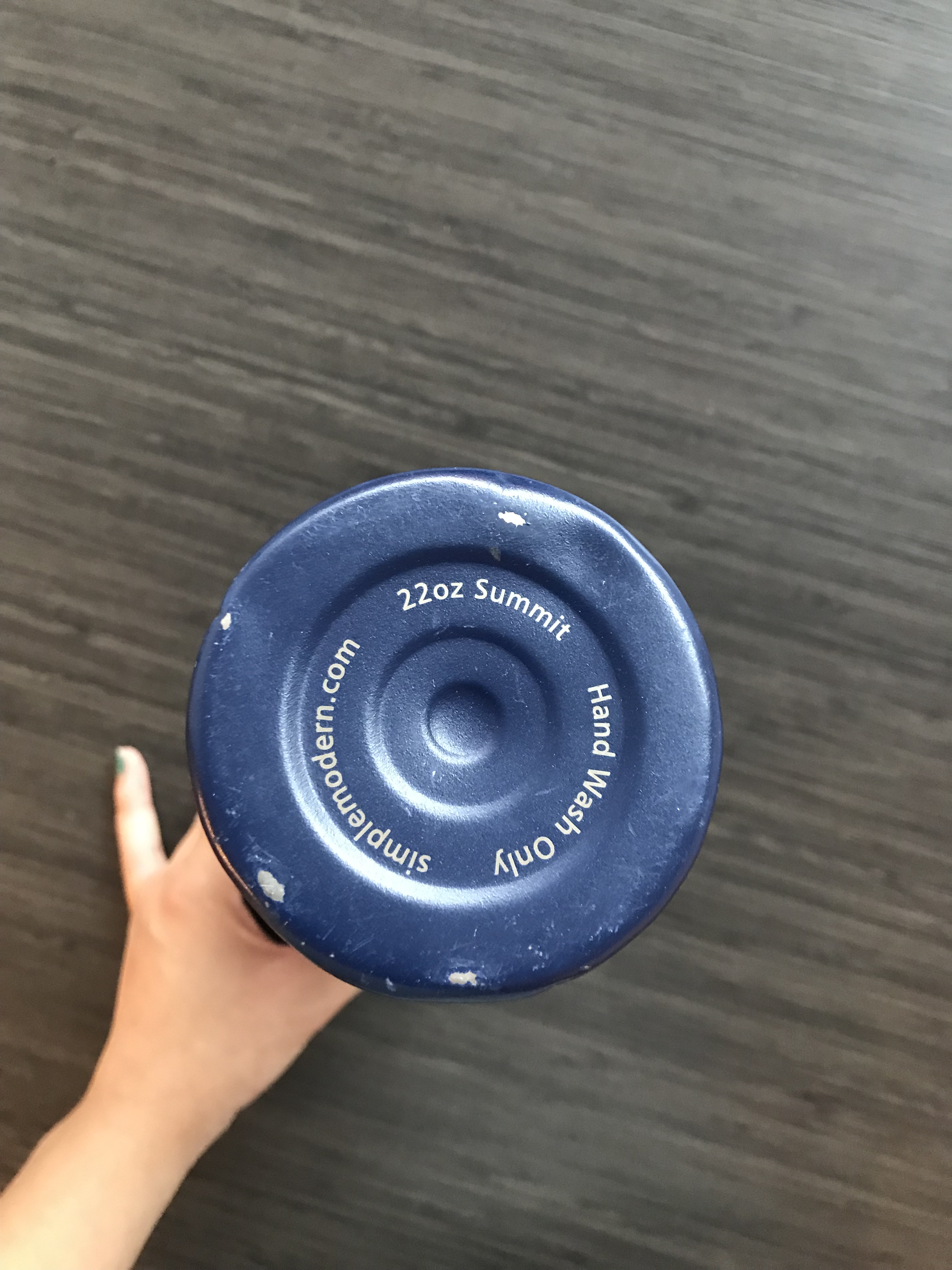 The bottle measures at 10 ¾ inches in height, with a 1 ⅝ inch radius. The body of the waterbottle is a stainless steel metal, a silver color. The outside metal body is thinly covered by a navy blue paint. On the body, there is a silver geometric line design. The geometric design is the result of the navy paint color being removed, to reveal the contrasting silver steel color of the bottle underneath. This is possibly the result of a laser removal process. At the bottom of the bottle, the silver letters S and M (the bottle company’s logo) are revealed in the same manner, sizing at about the size of a thumb print. When running your fingertips along the side of the bottle, you can feel the fine ridges where the paint layer has been removed for the design. The bottle has a few notches, scratches, and dents, mostly at the bottom of the bottle where the edge of the bottom and side surfaces meet. At the bottom end of the bottle, there are three circle ridges centered inside one another. The text, “Hand Wash Only, simplemodern.com, 22oz Summit” follows the circular circumference shape of the bottle bottom. The body of the waterbottle itself has no curves. It is a long cylinder shape, sized to fit inside the palm of a hand perfectly. There is one ridge at the top of the metal bottle, created for the edge of the body to meet the screw-on plastic cap.
