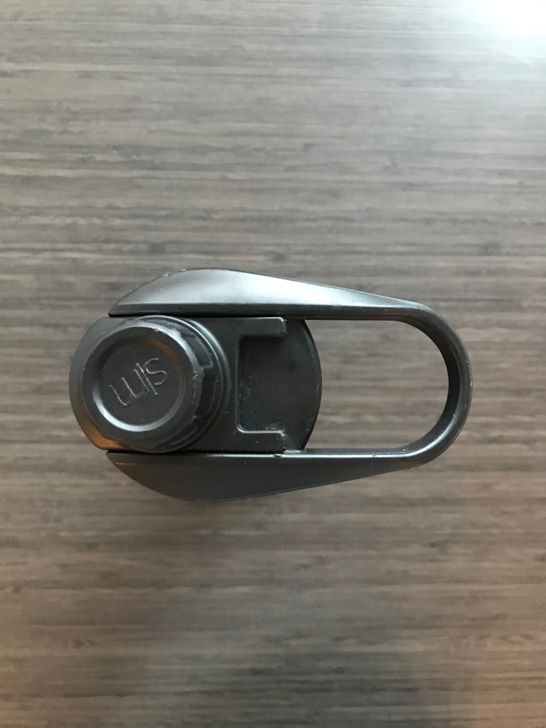 The cap of the waterbottle is thick black plastic. The cap has a cylinder base, with a handle extending outwards at a 90 degree angle. The handle does not move or rotate in any capacity. Rather, it is a full extension of the main cap base without any seams. The cap can be unscrewed to access the bottle, for filling and emptying. To drink, the cap has a small spout at the top, where the user can unscrew a small ridged cap to access. The spout can be measured to the size similar of a quarter. The cap has scratches and dents everywhere, hinting towards it’s age and use.