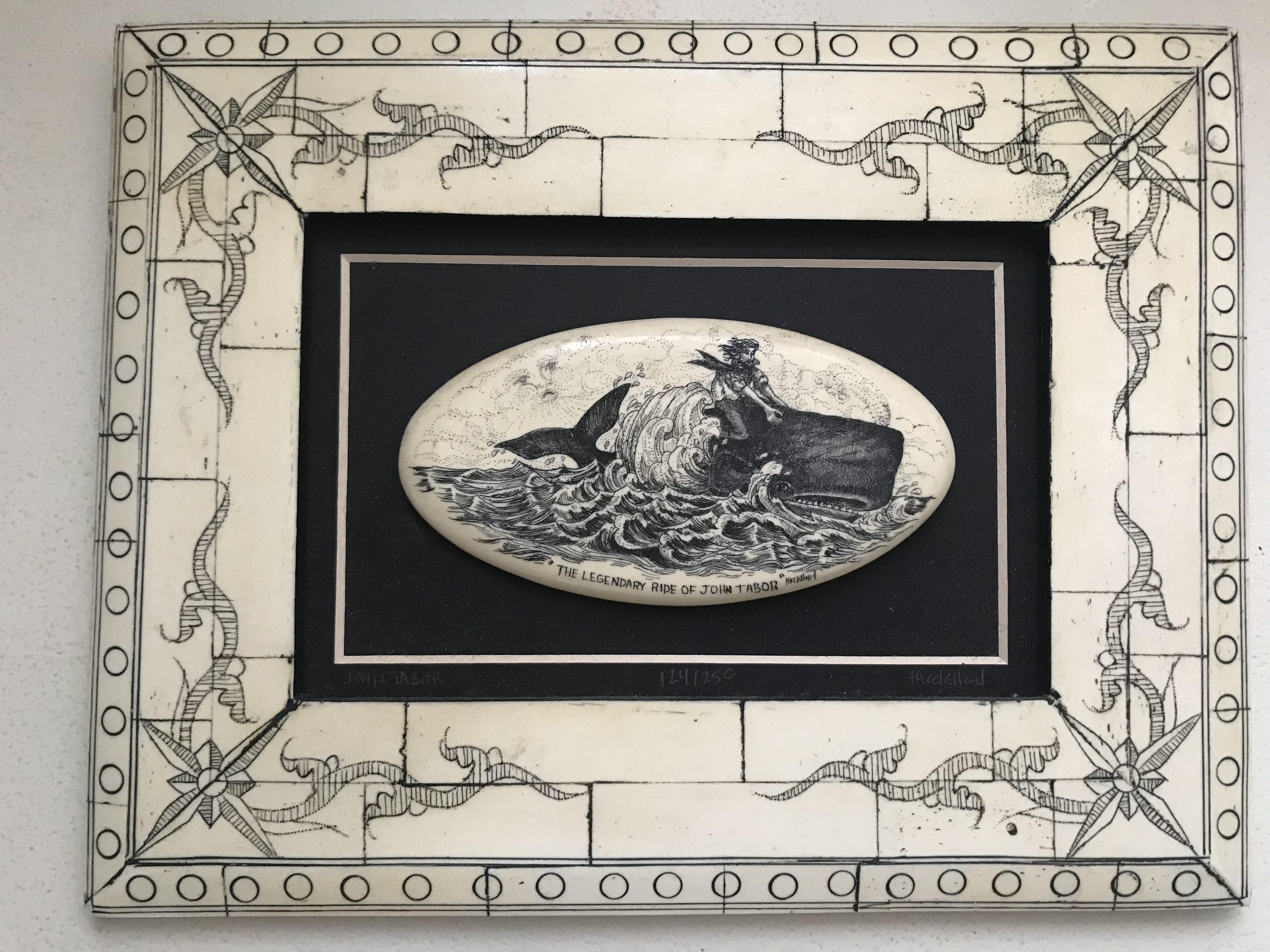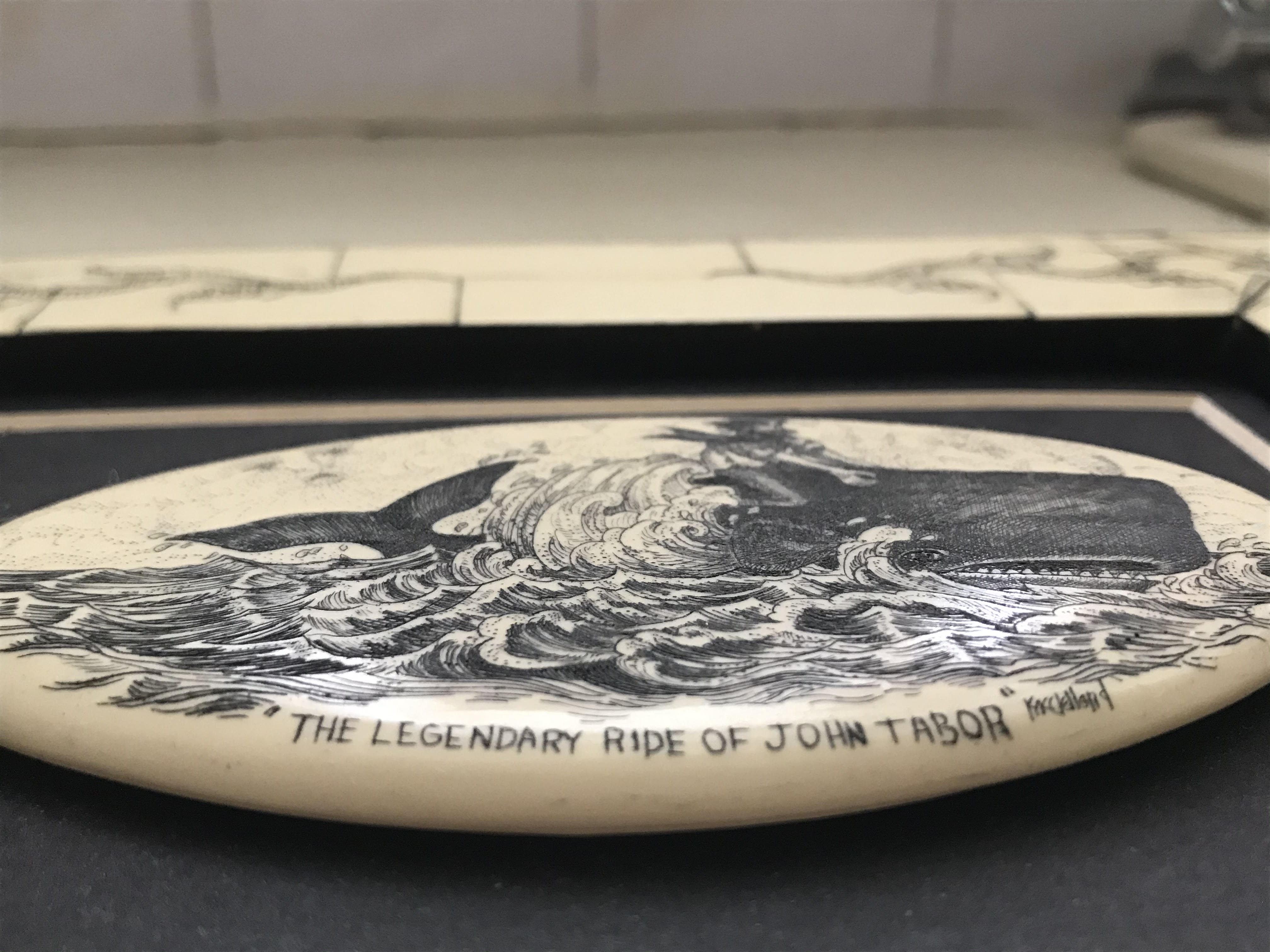 The object I wish to explore is a Christmas gift I received from my Aunt Laurie a few years ago after her trip to Norway. The framed medallion, considered a form of scrimshaw, depicts a man atop of a whale, breaching the surface of an ocean. Beneath the carefully carved, intricate scene has the words, “THE LEGENDARY RIDE OF JOHN TABOR” followed by an illegible signature of the author.