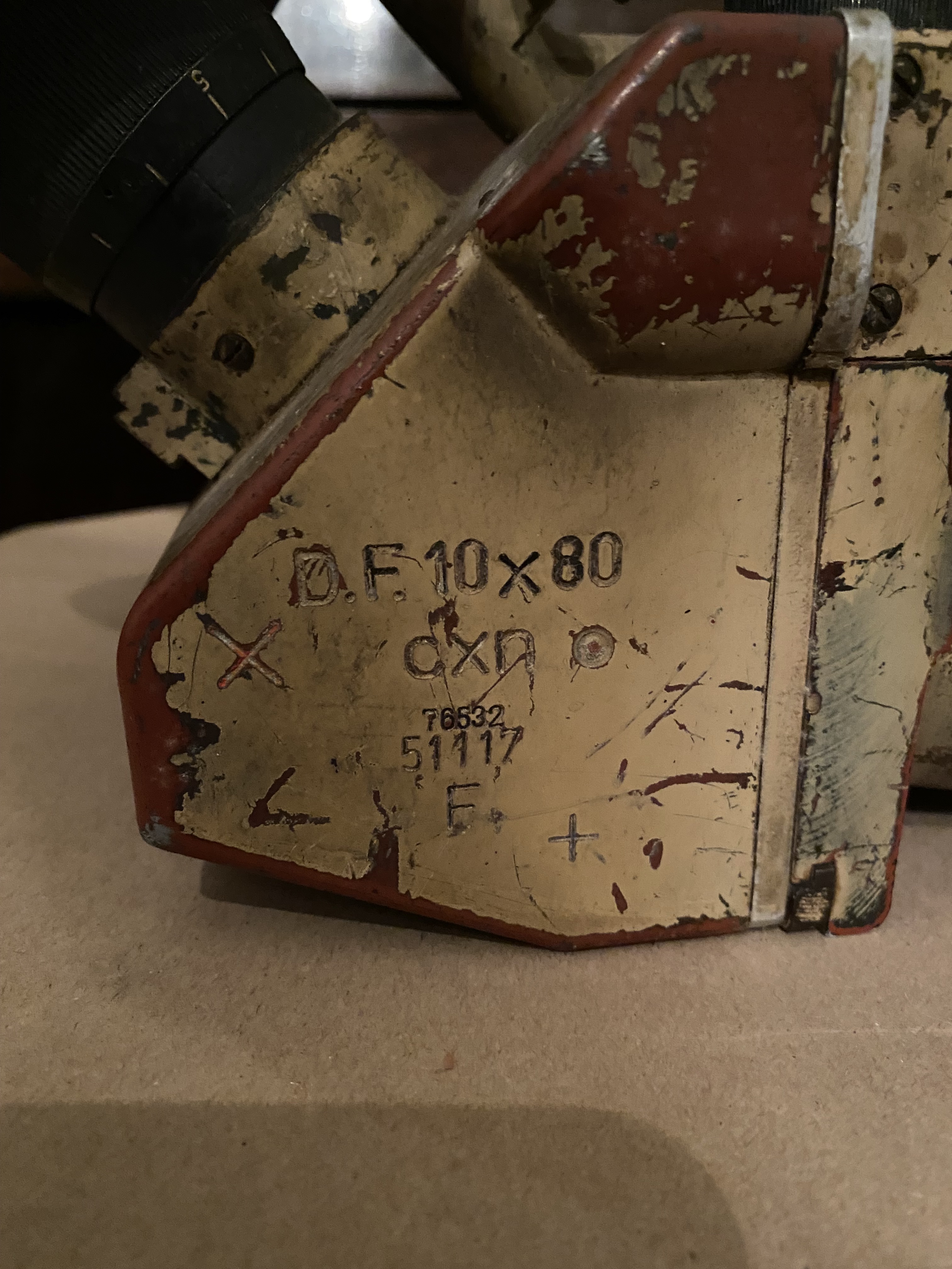 On the right side of the binoculars is an engraving reading, “D.F 10X 80, cxn, 76532, 51117, F.” While conducting my research I was able to learn that the D.F stands for Doppelfernrohr, a German word meaning “double telescope”. I was also able to find out that “cxn” isn’t just some random engraving, it’s the manufacturer’s code standing for E. Busch, Rathenow. This engraving is also able to tell me that these binoculars were made post 1942, and they were used by Luftwaffe Flak Artillery ground crews who had used them to spot and identify enemy aircraft. They had also been used on the battlefield for tactical observation.