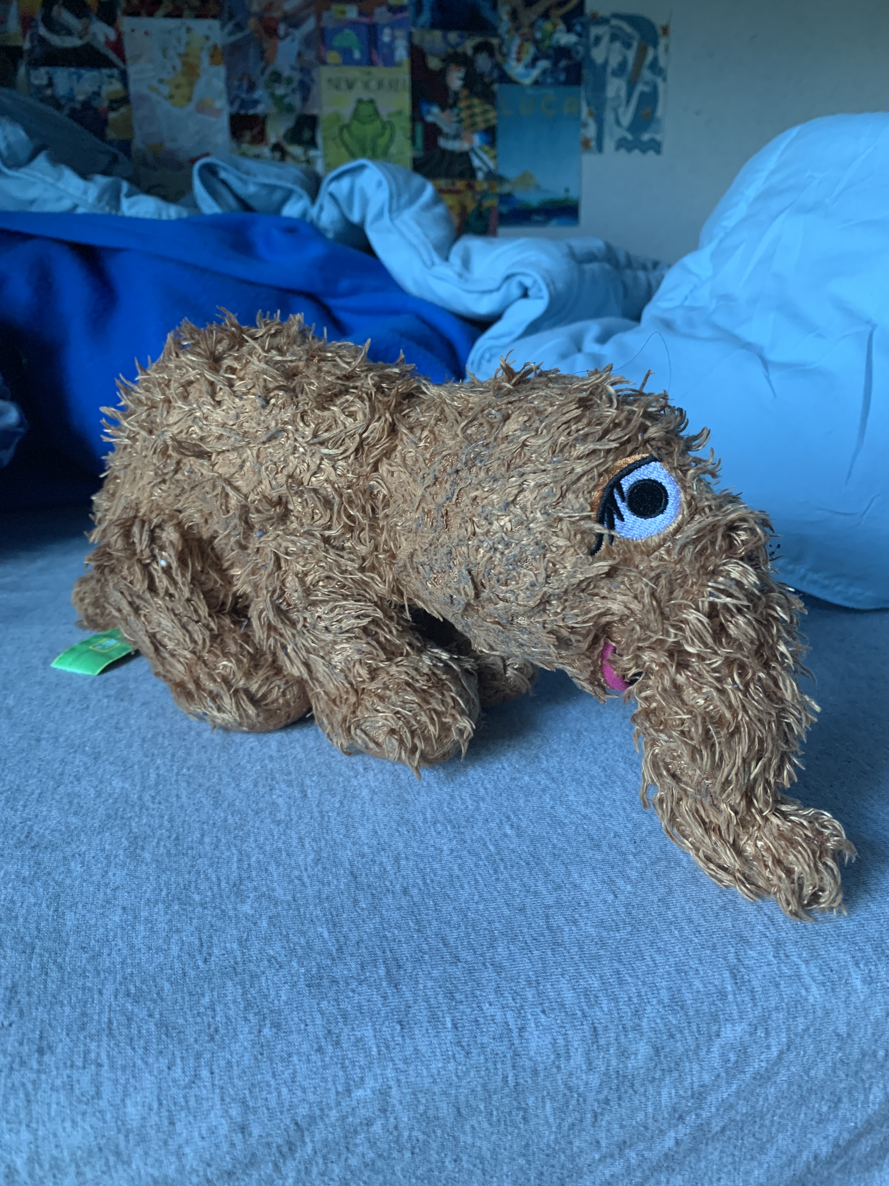 The item I chose for this assignment is a plush Snuffleupagus from Sesame Street that some friends gave to me the night before I had spinal surgery. I first found it in the hospital’s gift shop, on a rotating rack with other Sesame Street characters (I was 17 when I had the surgery, so I was staying in a children’s hospital). For reasons unknown, I felt immediately drawn to it. It was probably nostalgia, or the fact that Snuffleupagus seems like such an obscure character, even on a show like Sesame Street. It has become an important part of my nighttime routine, and I can’t seem to sleep if it’s not with me. According to its sewn-on tag, it is made of polyester fibers and stuffed with polyurethane foam.
