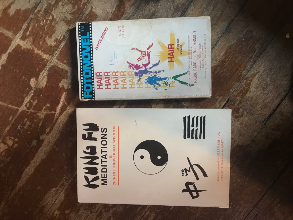 These two books were my mother’s when she was in high school, “Kung Fu Meditations” (my mom did kung-fu in high school), and a photo novel of the movie musical “Hair.”