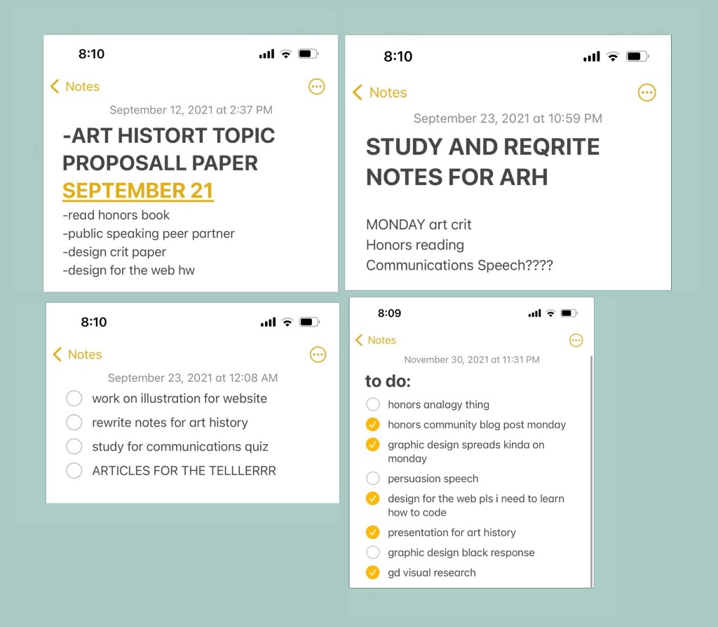 I noticed several patterns during the exercise of using a physical planner versus my phone notes app. I felt more inclined to do my work, because I saw the assignments in front of me, rather than hidden away in my phone. The exciting crossing-out-part was also a motivating factor. Despite these benefits, there were also several instances where I was inconvenienced by the physical space of the planner. It’s a bit twisted, but I am admittedly lazy and reliant on everything being right in my hand, as an extension of myself. And so, when I was in my bed late at night and wanting to remind myself of my tasks for the next day, I wasn’t too thrilled to know my physical planner was sitting at the bottom of my bookbag, which I was not of interest to get. Also, because the habits of my mind are accustomed to my “to-do’s” existing within my phone, I often forgot I was using the planner and barely brought it out in class.
