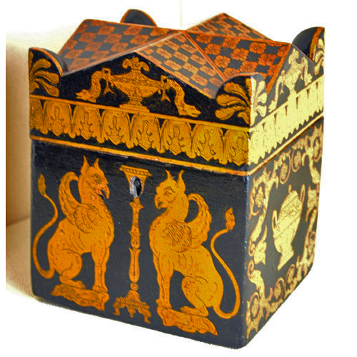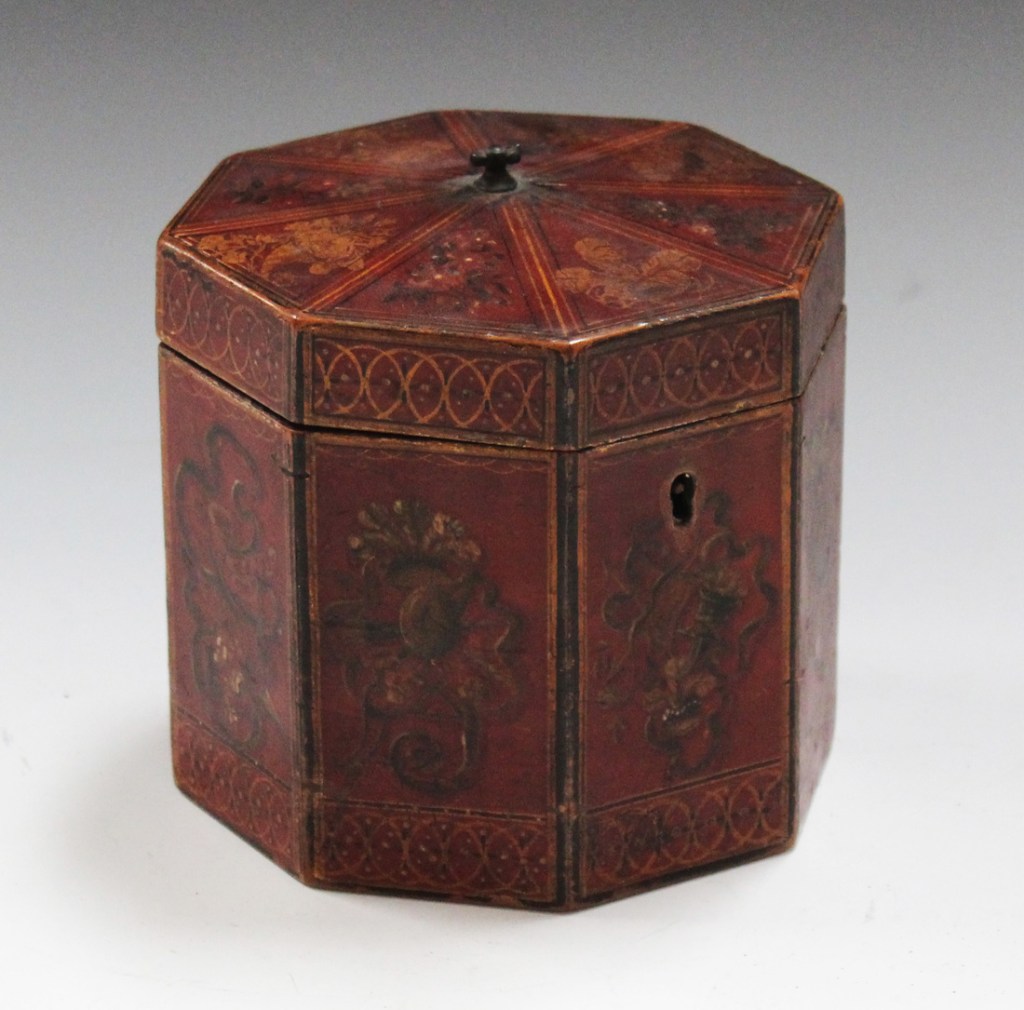 The tea chests themselves—much like tea—were initially imported from the East as well. Chinese tea chests or caddies were designed to hold approximately a pound of tea at a time. Though often made of wood, these caddies were sometimes made of pewter and even ivory or tortoise shell. The containers came in various shapes depending on their origin and typically had intricate designs fashioned from silver, brass, copper or gold. They could also come in a variety of shapes though the most common were rectangular and octagonal.