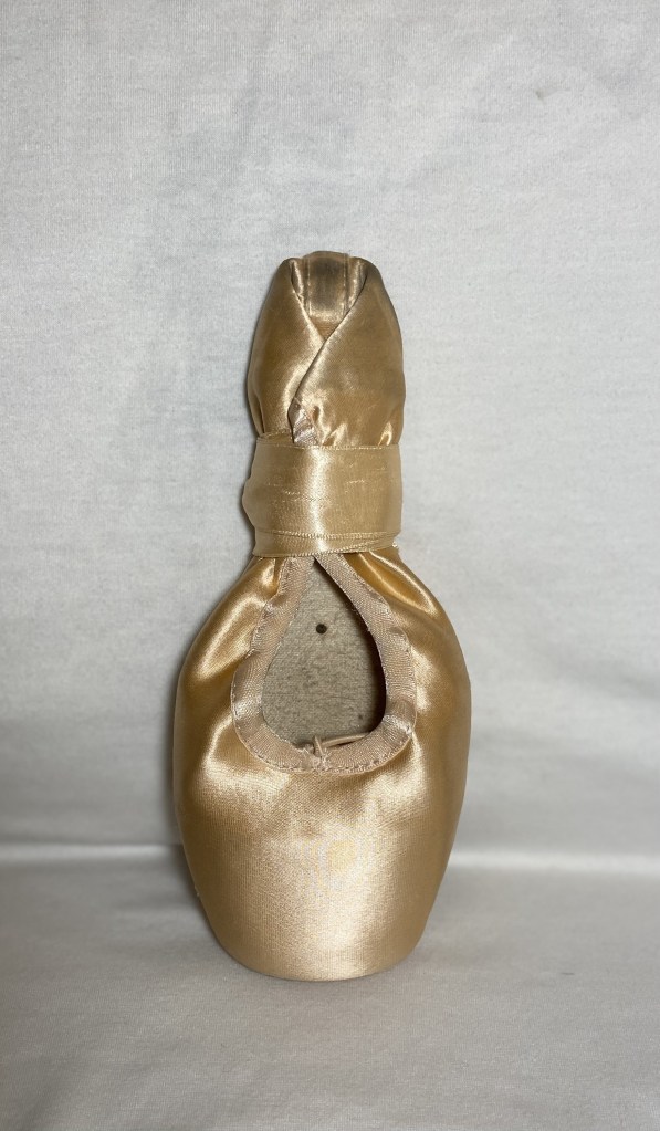 The shoe is about 7 ½ inches tall. It is shaped like a bowling pin, small at the top, pinched at the sides, round and thick, and then tapered at the base. The pointe shoe is wrapped in this traditional storage way creating a “y” shape at the top. The top of the pointe shoe is about an inch to an inch and a half in thickness. In the middle, between where the two lines of the “y” meet is a rectangle reinforcement strip that covers where the two sides of the shoe are sewn. This rectangle is tall and about one inch thick with a single stitch on either side. The satin on the very top and down the reinforcement strip of the shoe is lightly dusted with a gray tarnish. It is squeezed with a light pink satin ribbon about 7/8th of an inch in thickness. It appears that the ribbon is wrapped six times on top of each other, around the neck of the shoe. It looks as if the ribbon is acting like a corset containing and shaping the pointe shoe to this particular shape. The wrapping of the ribbon causes a ripple of creases to occur. Just below the ribbon, the shoe has a teardrop opening where a foot may go when it is unwrapped and unfolded. This teardrop shape is outlined with a 5/16th of an inch smooth material that is the same color as the ribbon, sewn together with a single line stitch. The teardrop outlined encases two thin, cylinder, ribbed elastic strings that are the same color as the outlined material. The elastic string is about 5 ½ inches long and knotted at the base. The remaining elastic string is pushed inside the pointe shoe.