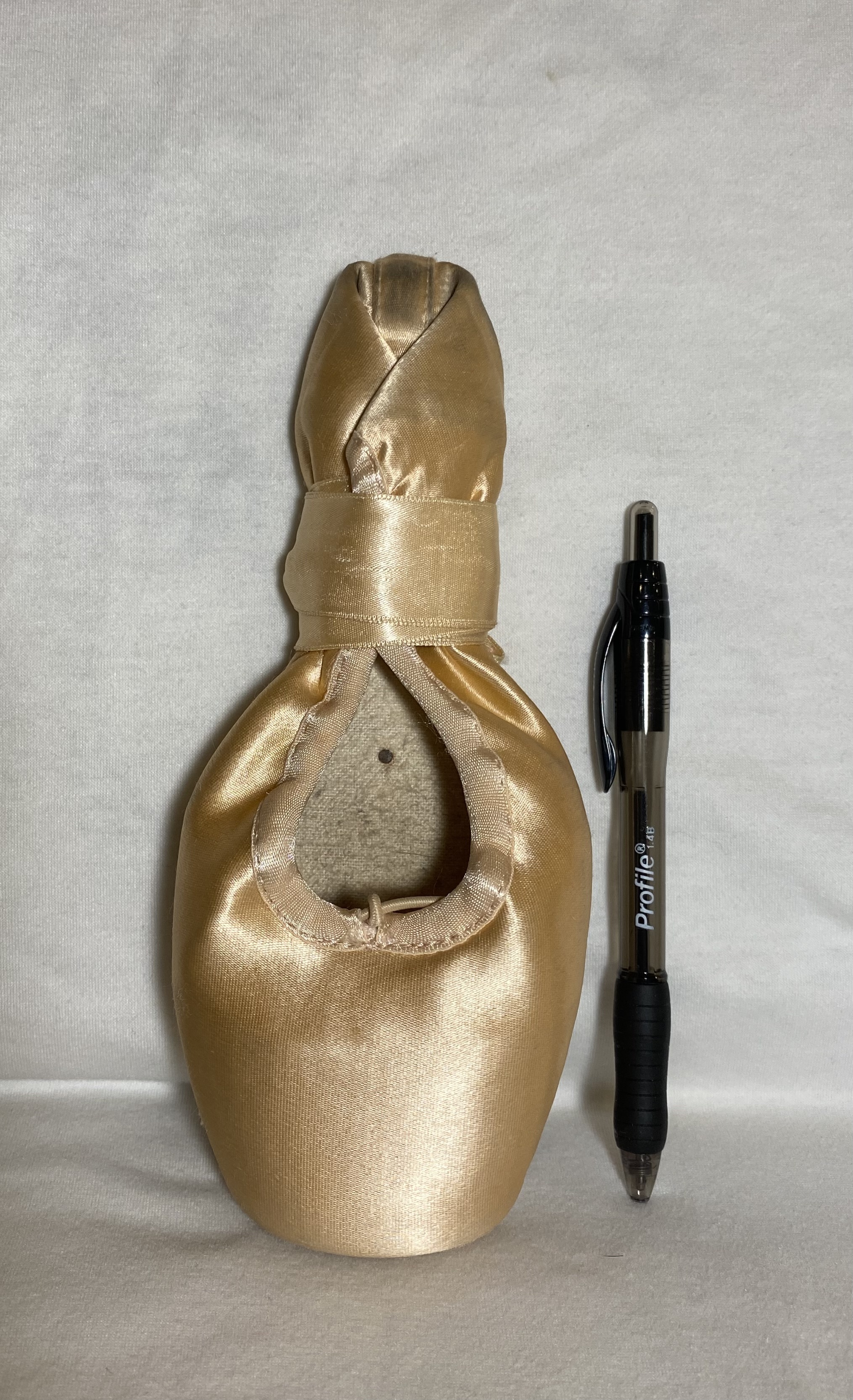 The shoe is about 7 ½ inches tall. It is shaped like a bowling pin, small at the top, pinched at the sides, round and thick, and then tapered at the base. The pointe shoe is wrapped in this traditional storage way creating a “y” shape at the top. The top of the pointe shoe is about an inch to an inch and a half in thickness. In the middle, between where the two lines of the “y” meet is a rectangle reinforcement strip that covers where the two sides of the shoe are sewn. This rectangle is tall and about one inch thick with a single stitch on either side. The satin on the very top and down the reinforcement strip of the shoe is lightly dusted with a gray tarnish. It is squeezed with a light pink satin ribbon about 7/8th of an inch in thickness. It appears that the ribbon is wrapped six times on top of each other, around the neck of the shoe. It looks as if the ribbon is acting like a corset containing and shaping the pointe shoe to this particular shape. The wrapping of the ribbon causes a ripple of creases to occur. Just below the ribbon, the shoe has a teardrop opening where a foot may go when it is unwrapped and unfolded. This teardrop shape is outlined with a 5/16th of an inch smooth material that is the same color as the ribbon, sewn together with a single line stitch. The teardrop outlined encases two thin, cylinder, ribbed elastic strings that are the same color as the outlined material. The elastic string is about 5 ½ inches long and knotted at the base. The remaining elastic string is pushed inside the pointe shoe.