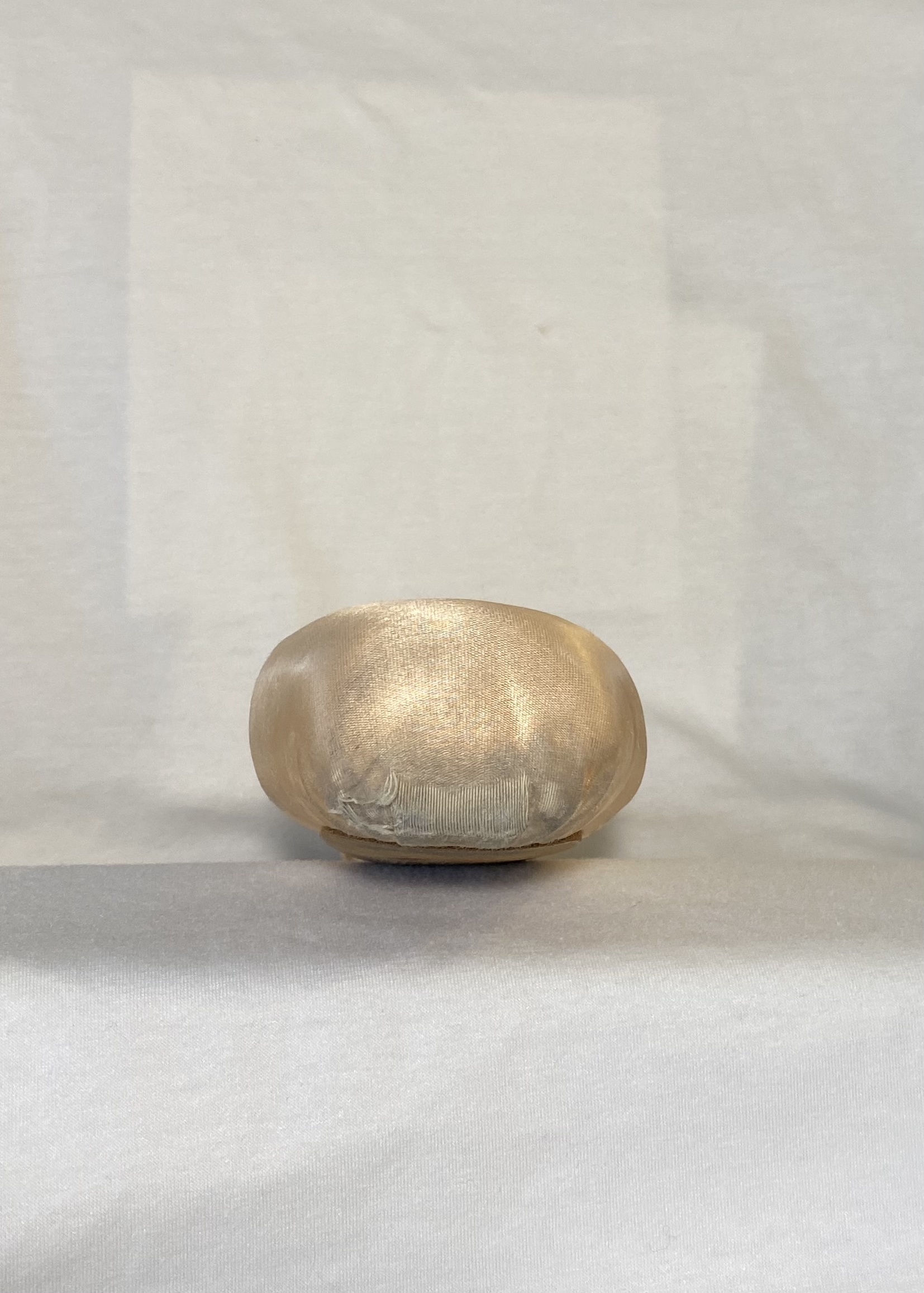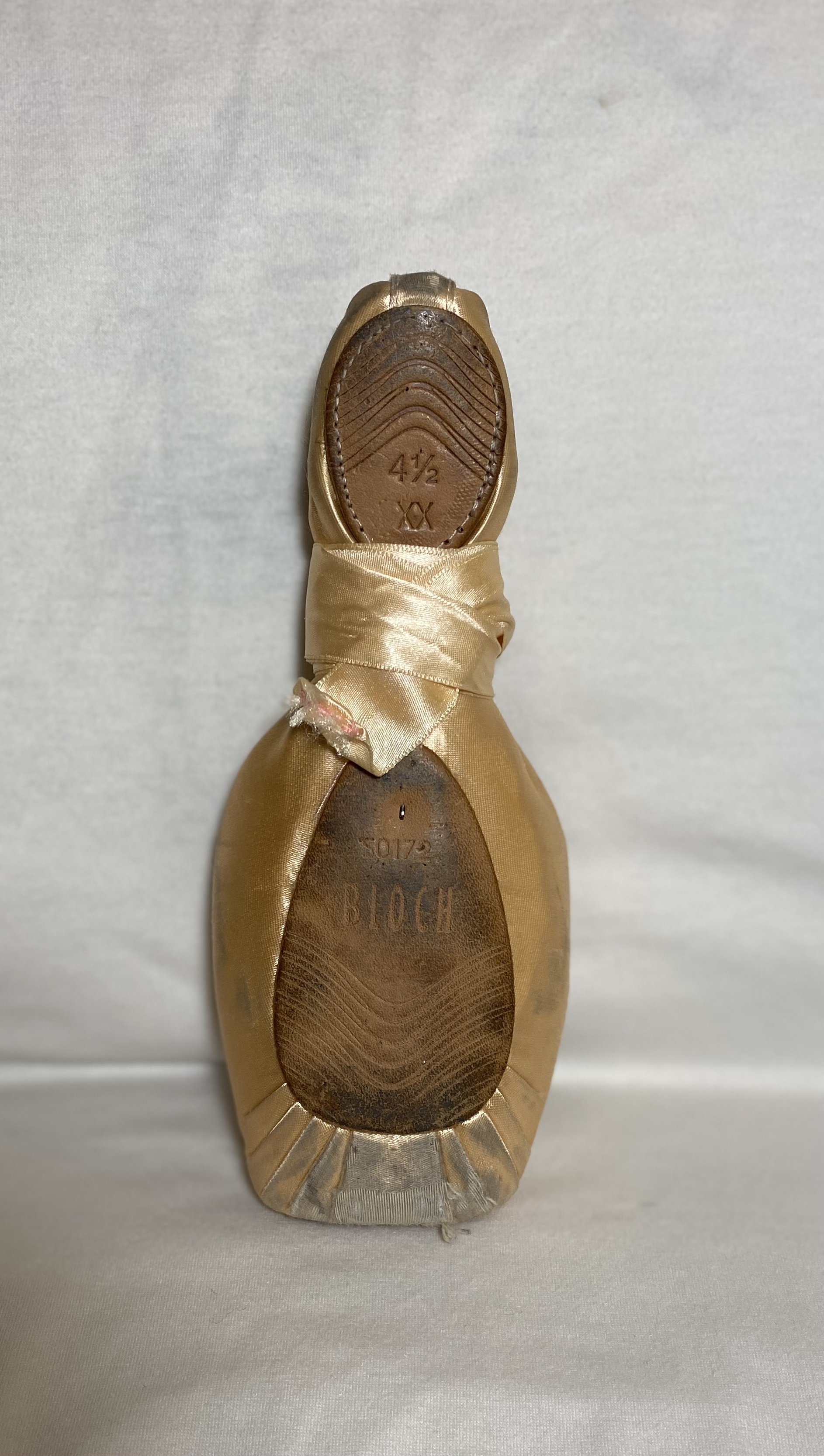 The rectangle from the top of the pointe shoe wraps around the back of the shoe and escapes under an upside side down egg-shaped leather sole. The leather is a milk chocolate brown color with single white stitching around the perimeter. The leather is also tarnished with a grey dusting and has six upward-facing curve designs pressed into the leather. Below the last curve is the number “4 ½” pressed into the leather of the shoe. Below that, are two capital “X’s” again pressed into the leather. The tip of the upside-down egg-shaped leather is cut off by the ribbons that wrap around the pointe shoe. The ribbons are crossed over each other making a small “y” pattern. It seems that the outer layer of ribbon that is on the front of the shoe is tucked under another piece of ribbon in the back. A small piece of the ribbon escapes the tuck and dangles outside this fold. The tip of the escaped piece of ribbon is folded and clumsily sewn with a cotton candy-colored string. The small piece of freed ribbon is frayed at the bottom and has pulls near the stitching. Below this, at the center base, is another leather sole that is in the shape of a candy corn that is the same color as the other sole with a darker grey tarnish dusting. The top of the sole has what looks to be a little metal staple puncturing the leather. Below this metal piece is the numbers “50172.” pressed into the leather. Under this is the word “BLOCH” in all capitals and the letters look slightly stretched, pressed into the leather. Under this is seven downward-facing curve designs pressed into the leather that becomes more faded at the bottom. Tucked underneath this leather sole are ten satin folds from the satin that wraps around the entire shoe. The middle folds are dusted in grey and again one sees the worn strings that appear to be the remains of satin.