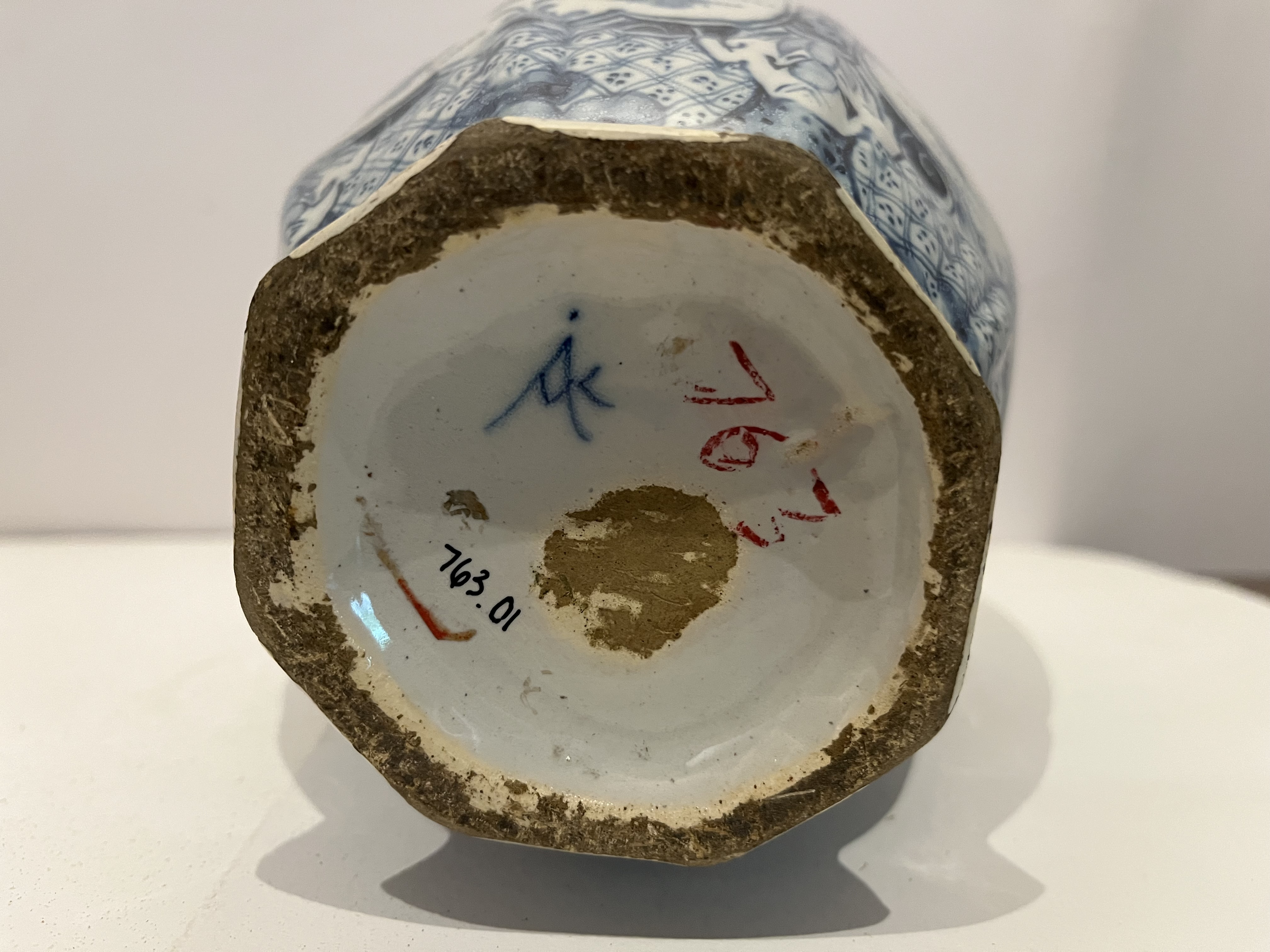 The bottom of the jar and the lid have a distinct ring of brown raw claw where they sat on the kiln shelf. It is a stark difference from the rest of the white piece. An ornate blue signature is also seen on the bottom of the vase and the lid, accompanied by a serial number written in marker.