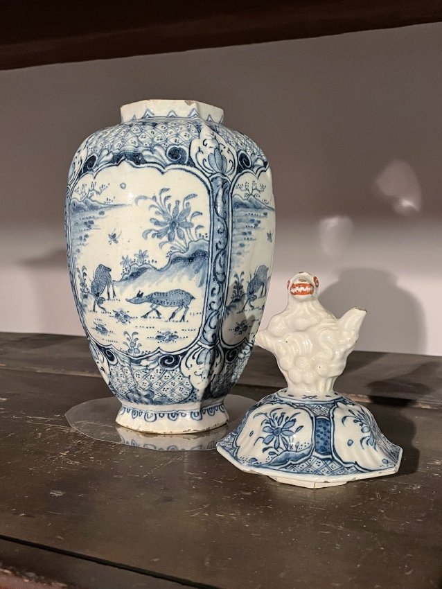 “The finials of these vases represent a Dutch interpretation of a Chinese architectural ornamentation. Foo dogs, or fu dogs, are lions typically made of stone and thought to protect against evil…To the Dutch, these beasts resembled the dogs they kept as pets, and foo dogs were painted to appear more familiar and dog-like. Dogs and other animals are a common motif on delftware”(HuguenotStreet).