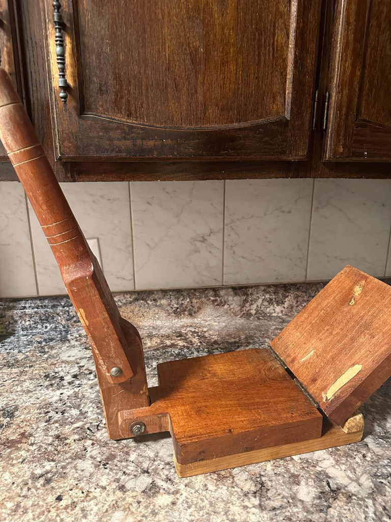 My mother’s tortilla press sits on the top shelf of our smaller second pantry. Most of the time it is stored away but comes out on special occasions. The wooden tortilla press is used in the process of making homemade corn tortillas. After the dough is made and separated into many small-sized balls, the tortilla press allows for an easy way to thin out the tortillas and make them the same size.