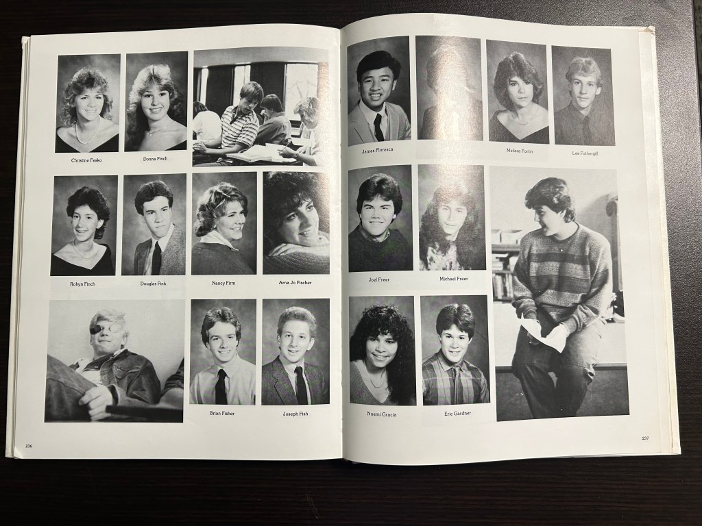 It’s crucial to remember that the yearbooks in this time were in black and white. In pages 1 through 15 of the yearbook, they give us some vibrant colors that are very expressive to the pictures that were used. Most are candid photos of students involved with the school whether that’s inside or outside the campus. The school portraits are everything that I’d envision an 80’s yearbook to be. Everyone in their senior portraits look like ghosts and had the most insane 80’s hairdo. My mom wasn’t fond of how her hair looked in the 80’s so she’s definitely embarrassed by this photo. My mom’s name is Robyn Finch and had short brown hair with curls that were given to everyone in my family but myself. She was wearing her black v-neck gown with a white strand of pearls around her neck for her senior portrait. Her head tilted slightly to the right as she looks past the camera with her piercing green eyes that were given to me.