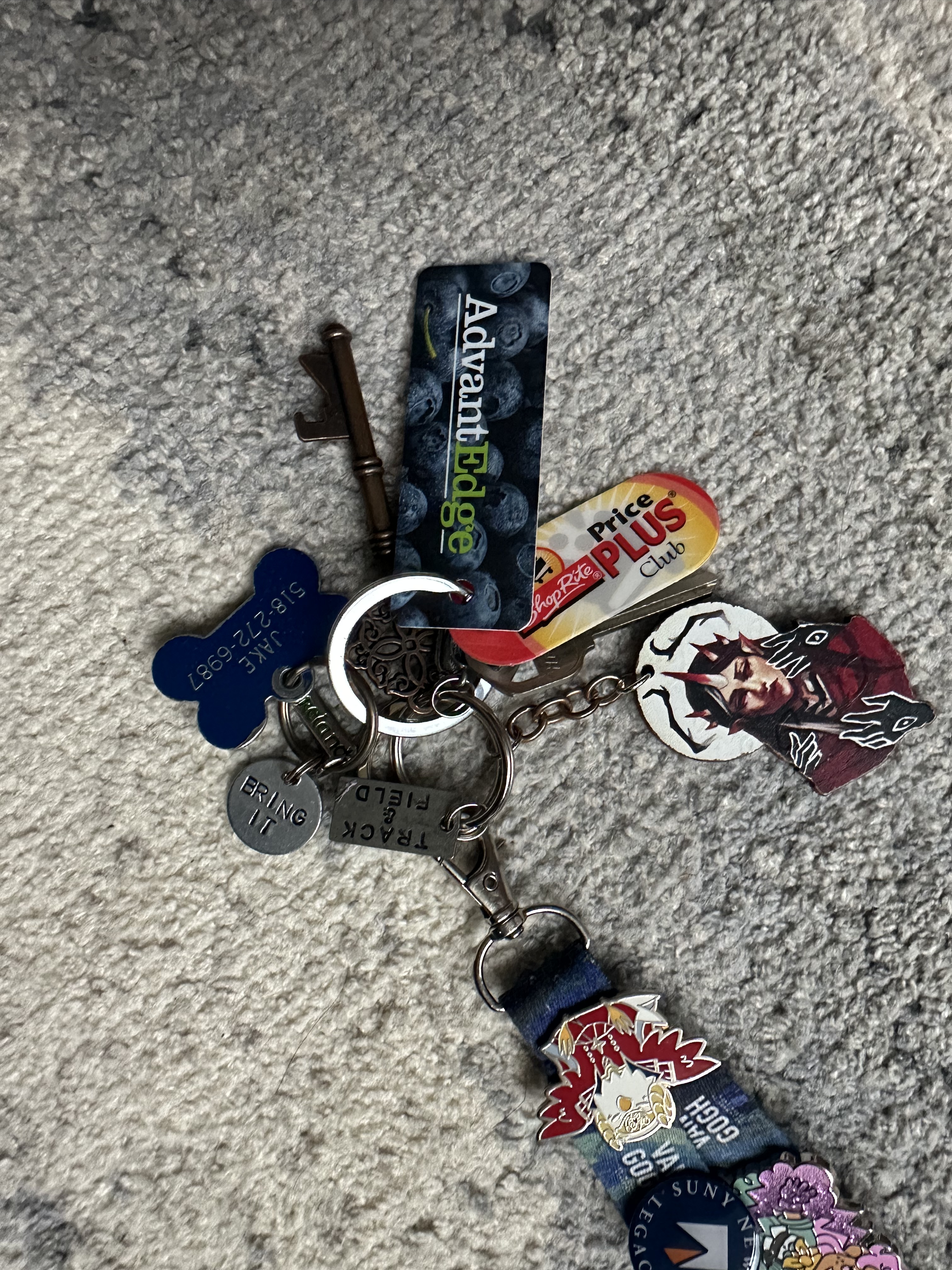 Shackled to the rope, are four circular rings, each able to be pulled to hook onto one another. A golden ring with six consecutive loops fixed together holds a humanoid figure with horns, brown hair, and black hands. The figure looks below, a stick-like design is presented over in the circular frame. Subsequently, another hoop is next. Three loops are locked together, one holds a key in the design of a lost artifact, bronze in color, and another is a bright silver key made from metal in the shape made for a lock, sharp and spiky by nature, with a windowish design on top. Alongside these forms, a circular metal says “BRING IT”, stamped by human hands likewise; a second medallion reads “Track & Field”. Alongside these two metal forms is a third bone-shaped metal tag, that reads “JAKE 518-272-6987”. Beside these metal medallions lie two oval-shaped plastic cards. They read “AdvantEdge” with “Advant” in white and “Edge” in green, with blueberries enveloping the background. On the flip side, there is a barcode and numbers on a white background. Paired with the second smaller card, adorned in red and yellow, reads “ShopRite Price Plus Club” with a shopping card logo. Similar to its partner, it has a barcode and numbers on the backside.
