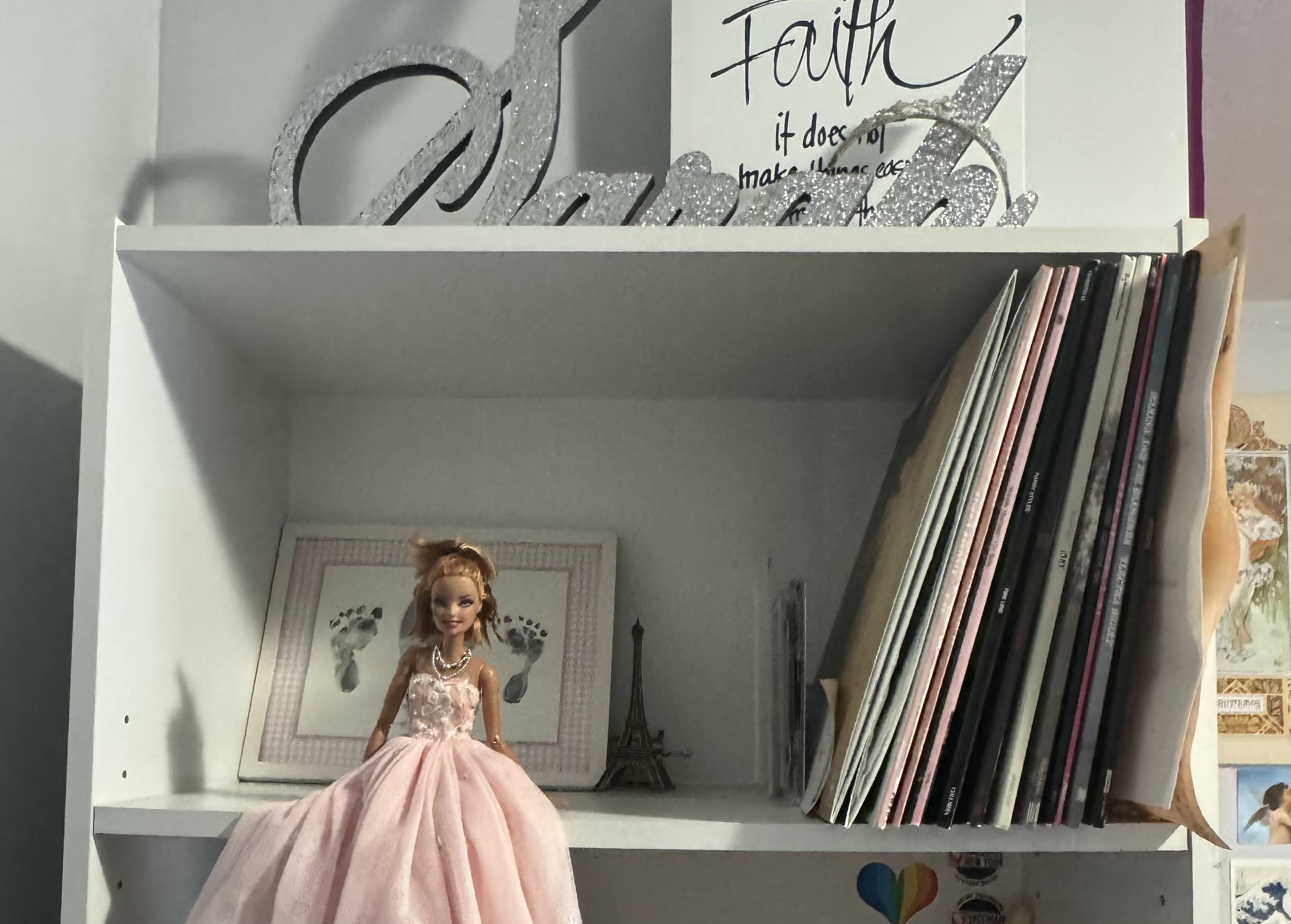 The doll is a symbol of my childhood– an artifact from the most precious and innocent moments of my life. A faded smiley face drawn on her cheek from my sister and I’s failed attempt at giving her a tattoo. Her botched haircut from the days we swore we were hairdressers. Her body, which my sister replaced with a newer version after her old one was broken, with an arm and leg taped on. She, admittedly a bit morbidly, took the head off the old Barbie and put it on the new one, but she would’ve done anything to make me happy. Taylor watched every stage of my life. She sits on the top shelf of my bookcase, in front of my framed newborn footprints and next to my vinyl collection. She watched my bedsheets change from pink Disney Princesses to white minimalist and saw the decorations on my wall change from pictures drawn with my friends to posters of my favorite artists. She watched me go from picking my outfit out for third grade picture day, to packing up to move into my first college dorm. Taylor is my days of being a little sister growing up with her big sister. Young girls dreaming of all the possibilities life holds.
