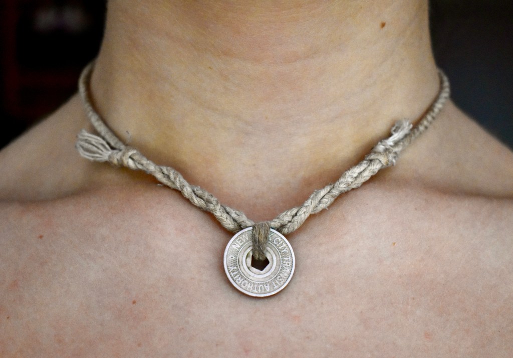 About three years ago (when he first found it), Eric fashioned the token onto a metal chain that he wore around his neck consistently for quite a while. Eventually, the chain had seen better days and snapped, no longer able to hold the token. Eric kept the token, awaiting a time when he came across a more functional chain to replace the old one. That led me to question why he eventually fashioned the token onto a twine necklace and then gifted it to me. Eric said he wanted to give me a gift that was unique and special to him; it being special to him because he believed that his father kept the token for a reason. That statement sparked more interest in me, since Eric had not known the reason why his father kept the token.