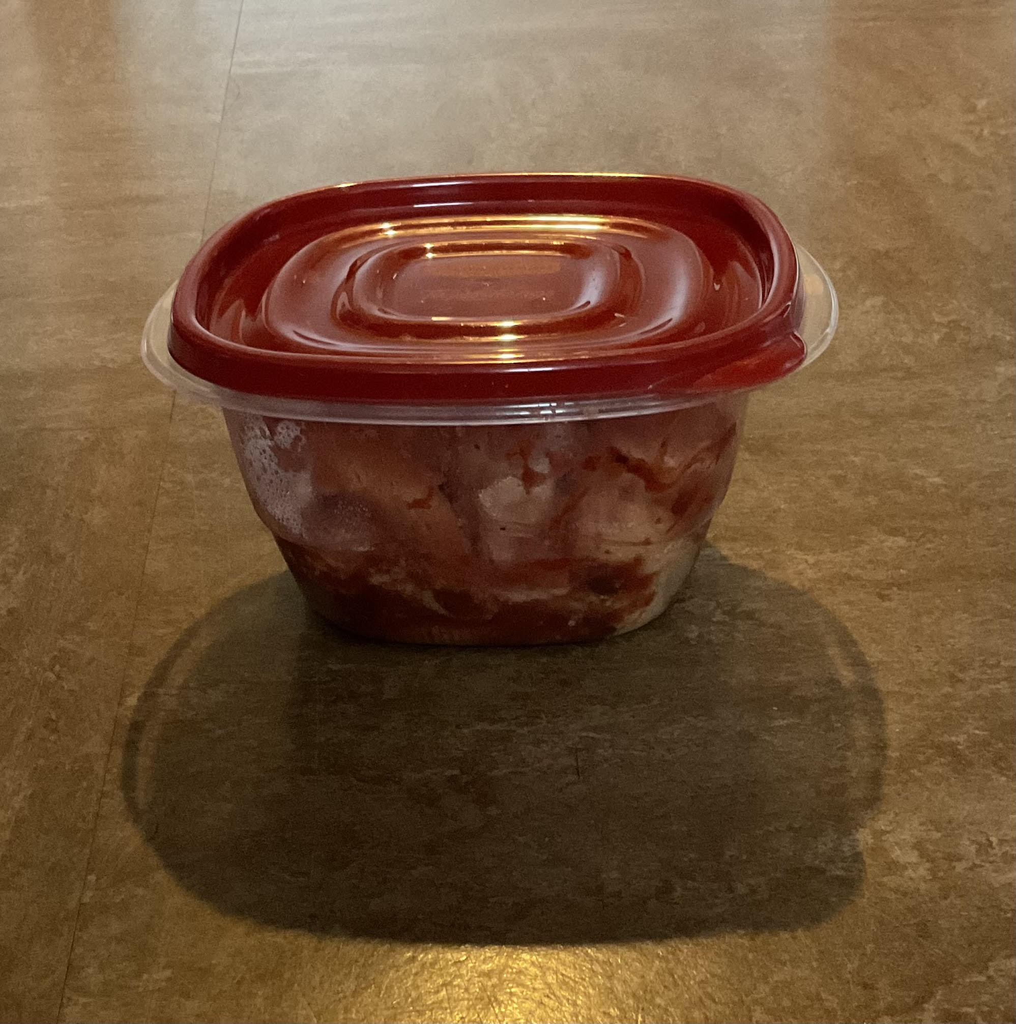 The container is a plastic to-go container, manufactured by Rubbermaid in their TakeAlongs line. The container itself is made of transparent, mostly inflexible plastic, and the cover is a deep, vibrant red made of opaque plastic. The container tapers slightly towards the base but the overall shape is square with the corners being rounded for easy cleaning. On either side of the container, the transparent plastic extends past the seal of the lid in order to provide a safe place to hold after heating. This particular container size is marketed as their 5.3 cup size, despite its capacity being listed as 5.2 cups. The dimensions listed on the Rubbermaid website for the medium square size container are ‘6.372 by 6.982 by 4.125’ and by itself weighs .32 pounds.